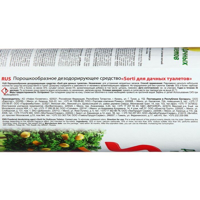 Ниже Вы можете прочитать отзывы на Средство Sorti для дачного туалета / Дезодорирующее средство нейтрализатор запаха для уличного туалета, 1 банка 500 гр, ознакомится с подробными характеристиками, посмотреть интересные обзоры и фотографии на Средство Sorti для дачного туалета / Дезодорирующее средство нейтрализатор запаха для уличного туалета, 1 банка 500 гр.