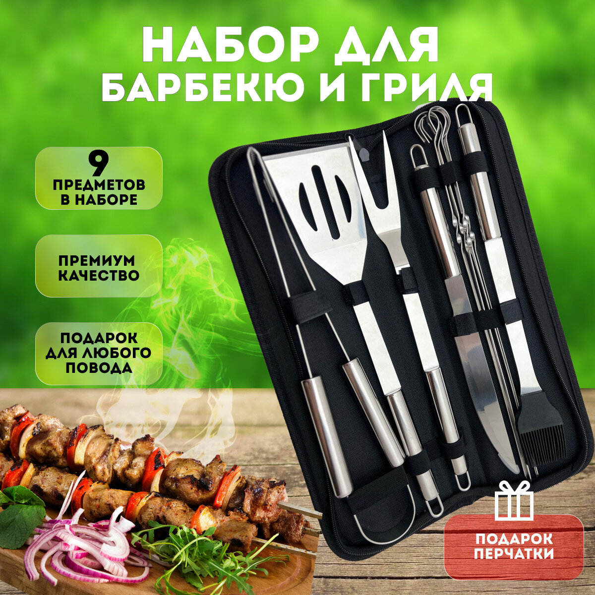 Набор для барбекю 9 предметов (Набор для пикника/гриля/мангала), нержавеющая сталь, перчатки в подарок, чехол в комплекте! интересное: