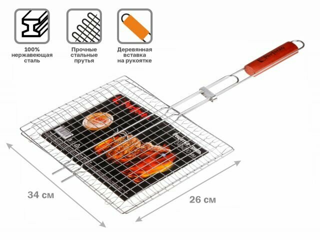 Решетка-гриль, 280x220 мм, нержавеющая сталь, деревянная ручка, PERFECTO LINEA (Изготовлена из 100% нержавеющей стали. Гигиенична, безопасна, долгове
