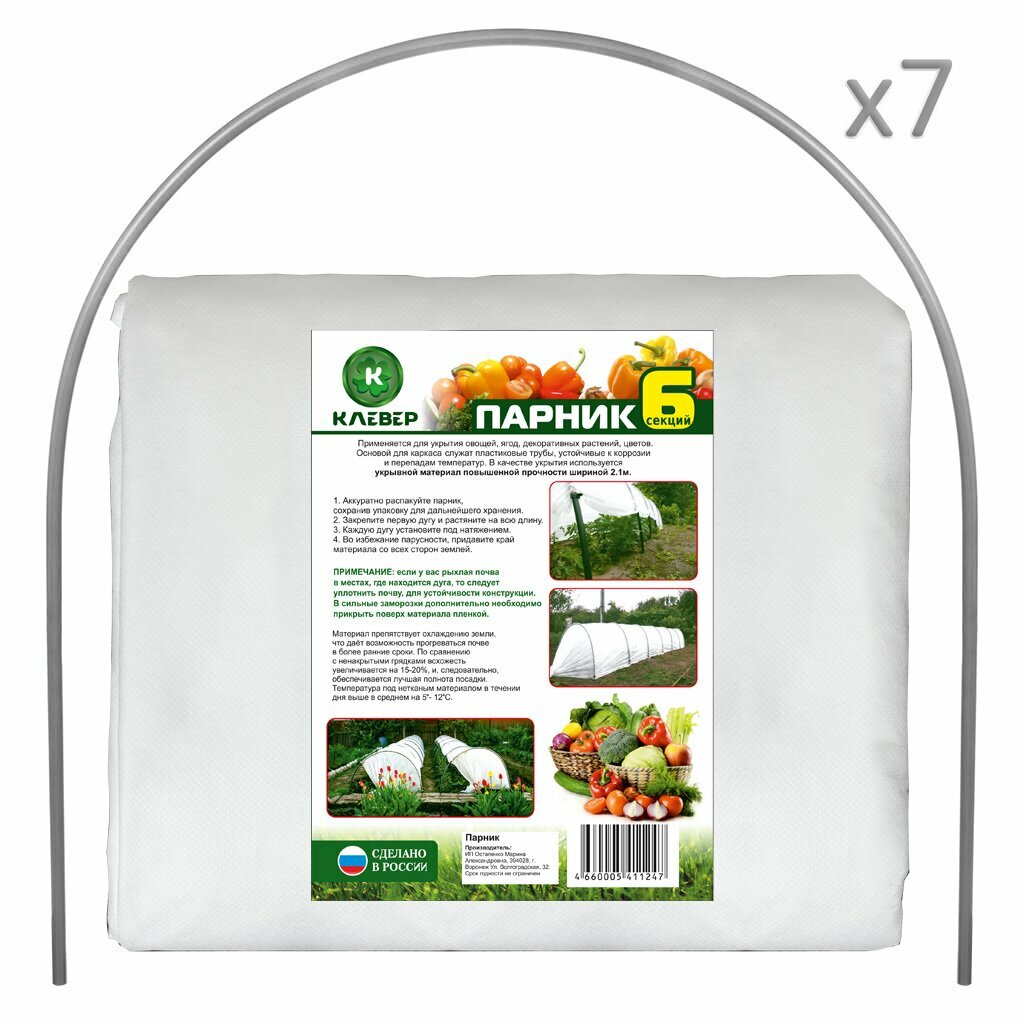 | Дополнительная информация | парник клевер легок и компактен, в сложенном виде его можно разместить в багажнике автомобиля, быстро собирается и разбирается, возможность многократного использования, повышает урожайность, сокращает время вызревания, позволяет ранний посев и посадку, защищает от неблагоприятных условий окружающей среды, защищает от вредителей и мелких животных, плотность укрывного материала 42 г/м³, ширина материала 2.1 м, длина дуг 2.5 м, высота дуг 104 см |