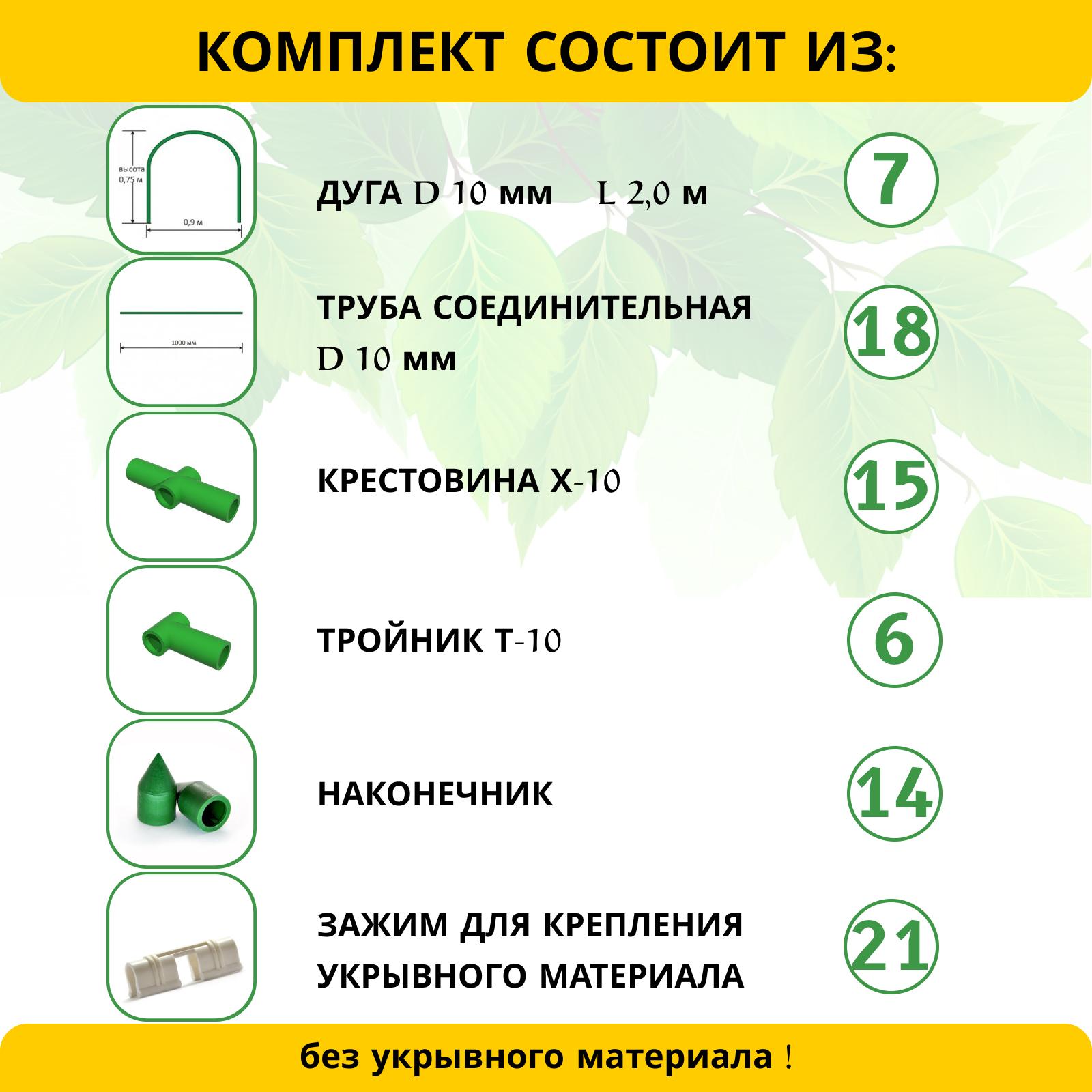 | Комплектация | Дуги для парника - 4 шт, перемычки (1,0 м) - 9 шт, тройник - 6 шт, крестовина - 6 шт, наконечник острый - 8 шт, зажим для пленки - 12 шт |