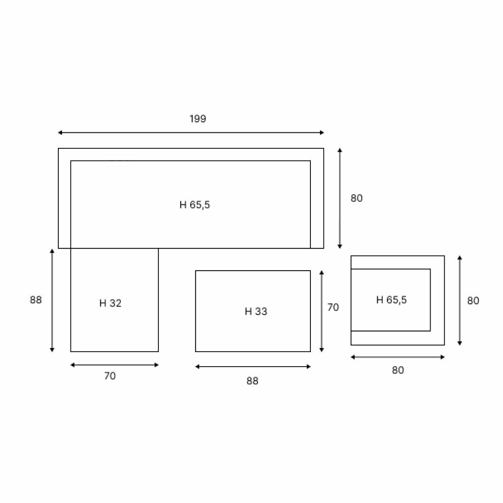 | Габариты | Трёхместный диван - 199х80х65,5 см; Кресло - 80х80х65,5 см; Пуф - 88х70х32 см; Стол - 88х70х33 см. |