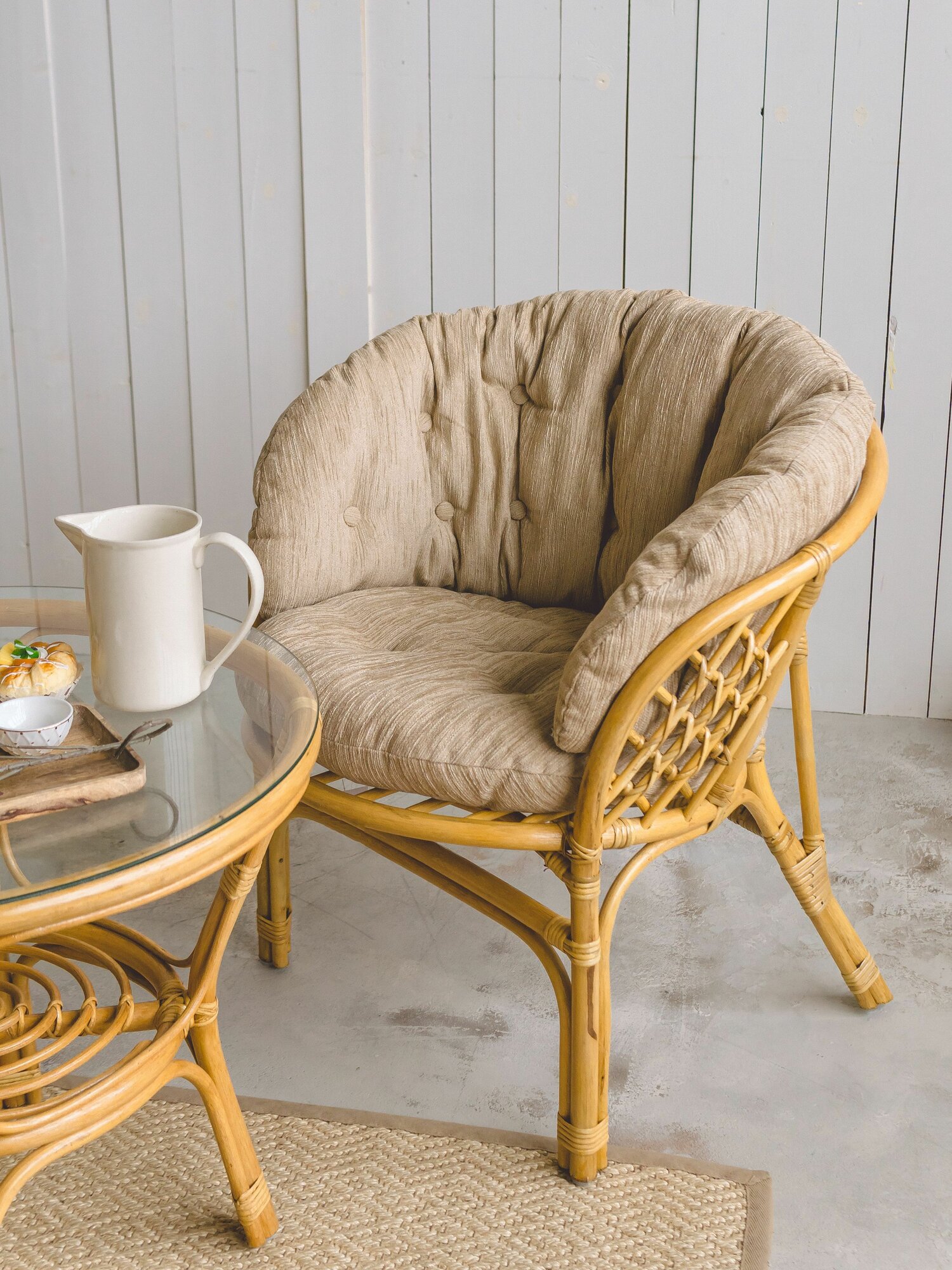 Комплект плетёной мебели из натурального ротанга с мягкими подушками интересное: