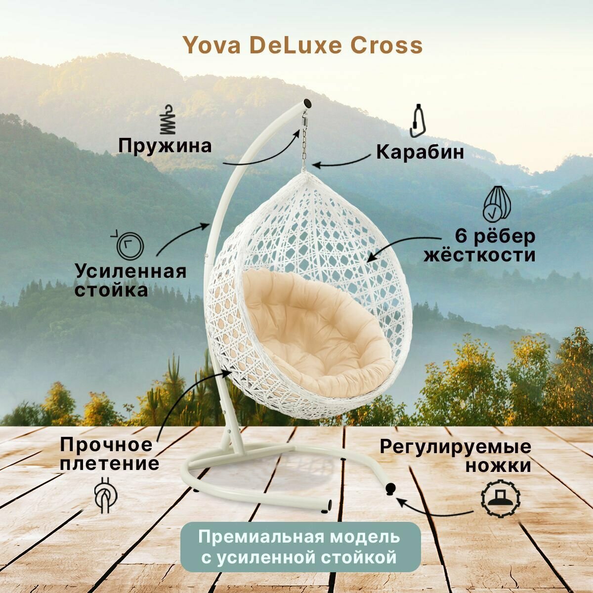 Купить Подвесное кресло кокон садовое Barberries Yova DeLuxe Cross. Стойка белая до 225 кг, подушка круглая бежевая