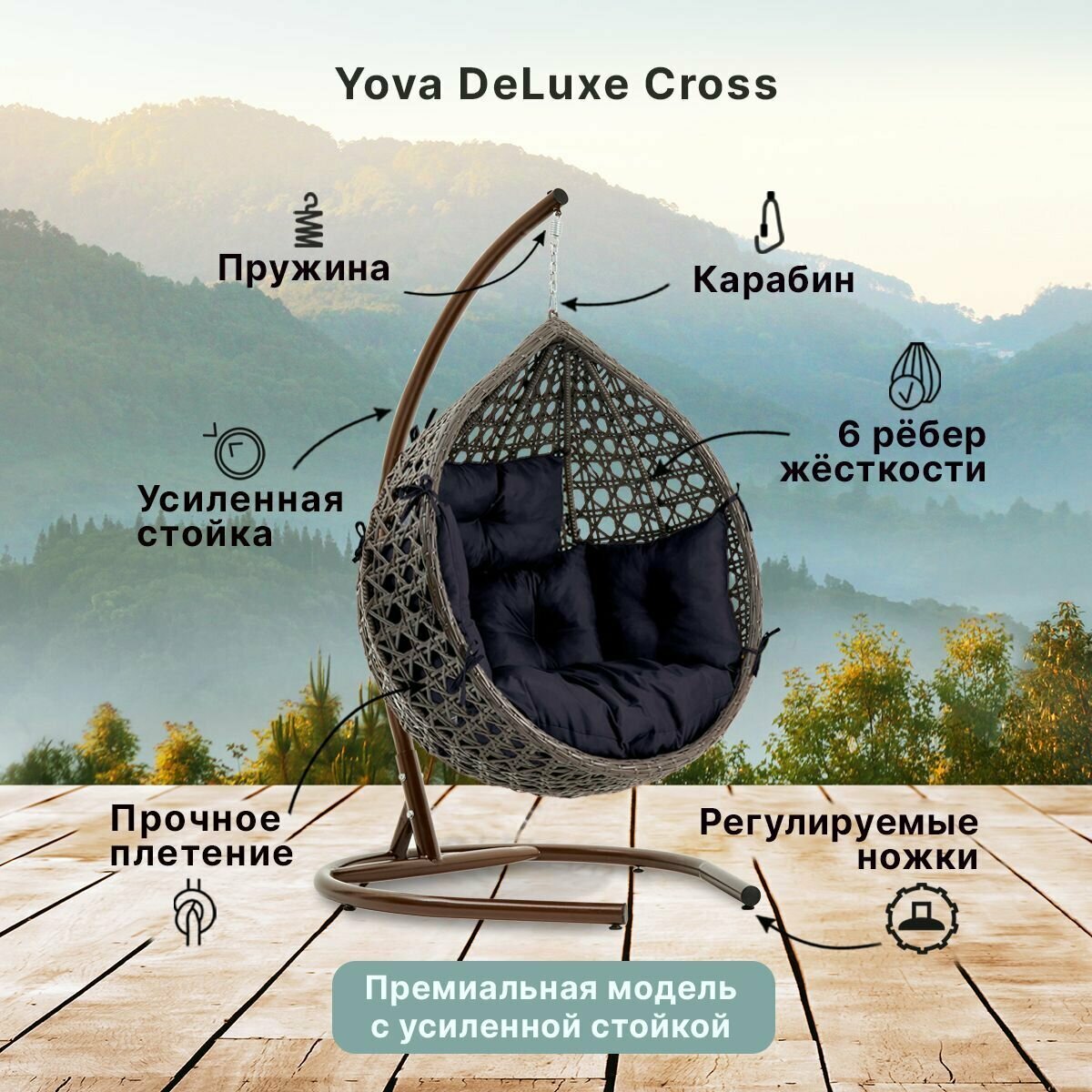 Подвесное кресло кокон садовое Barberries Yova DeLuxe Cross. Стойка венге до 225 кг, подушка комфорт серая