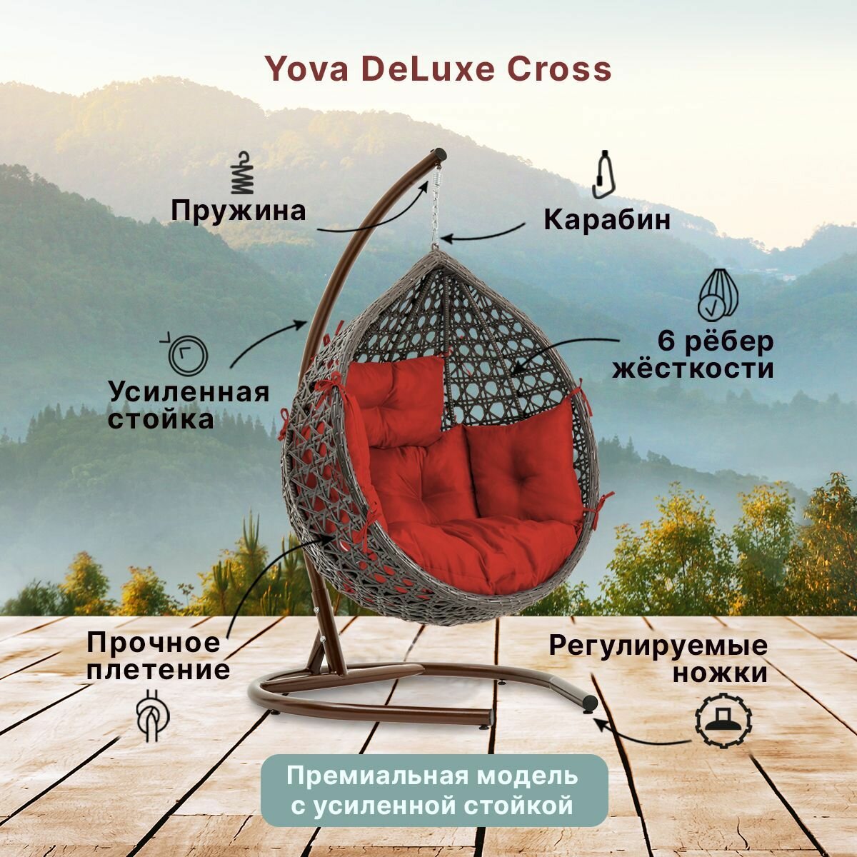 Купить Подвесное кресло кокон садовое Barberries Yova DeLuxe Cross. Стойка венге до 225 кг, подушка комфорт красная