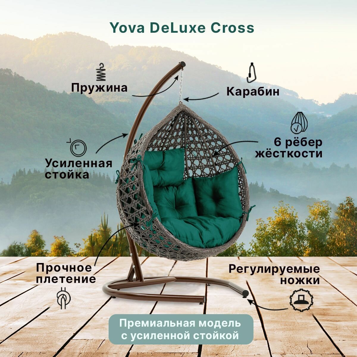 СохранитьПодвесное кресло кокон садовое Barberries Yova DeLuxe Cross. Стойка венге до 225 кг, подушка комфорт зеленая интересное: