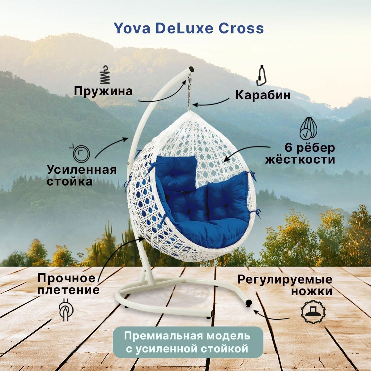 Купить Подвесное кресло кокон садовое Barberries Yova DeLuxe Cross. Стойка белая до 225 кг, подушка комфорт синяя