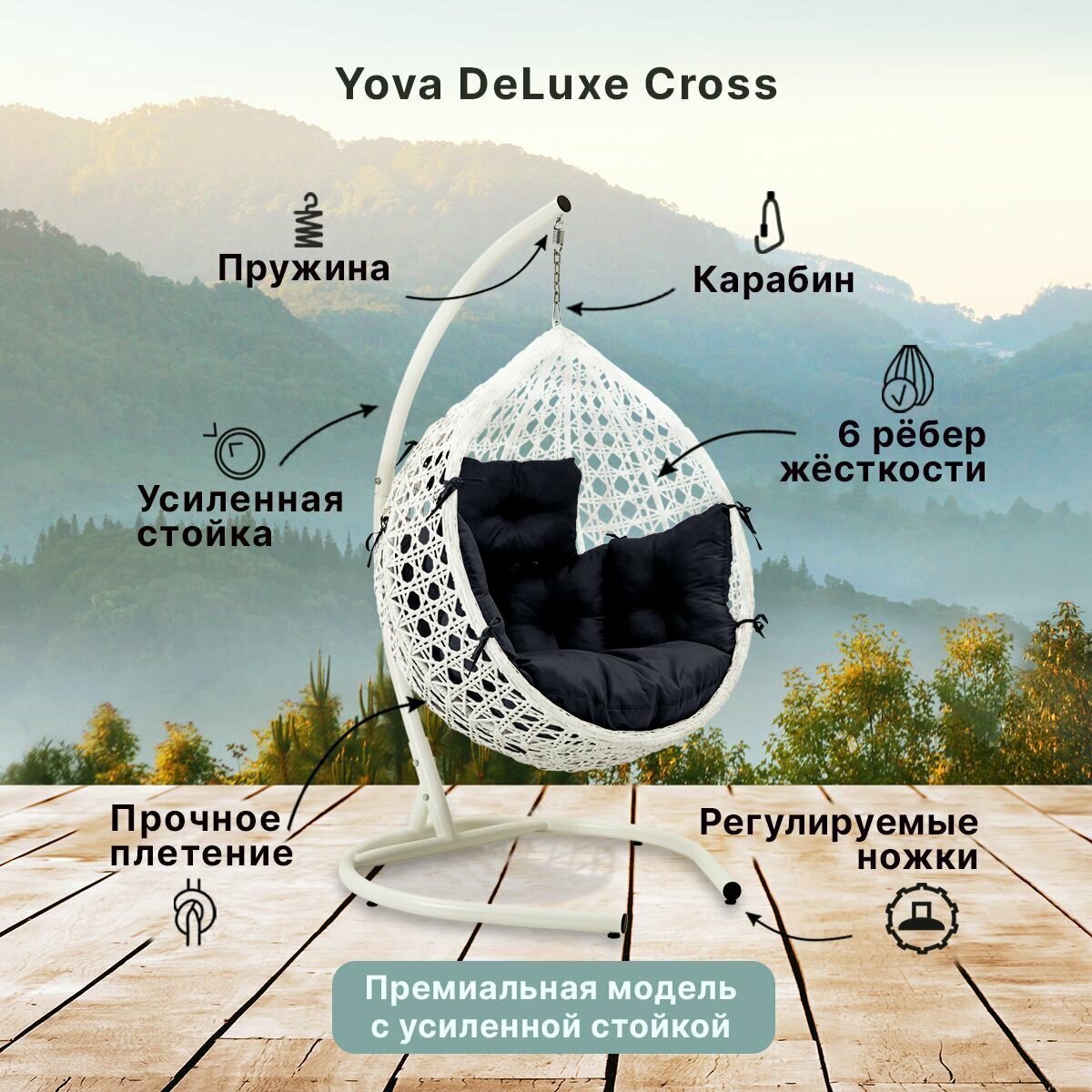Купить Подвесное кресло кокон садовое Barberries Yova DeLuxe Cross. Стойка белая до 225 кг, подушка комфорт черная