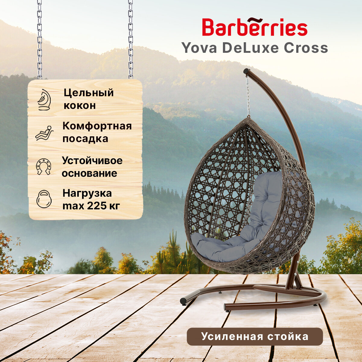 СохранитьПодвесное кресло кокон садовое Barberries Yova DeLuxe Cross. Стойка венге до 225 кг, подушка трапеция серая интересное: