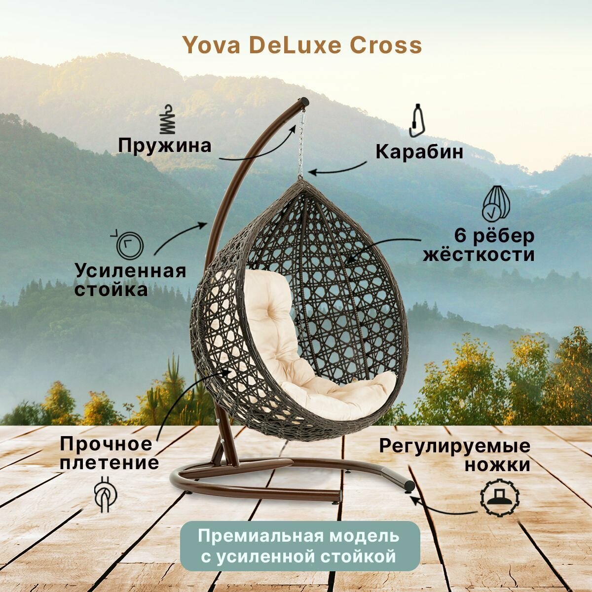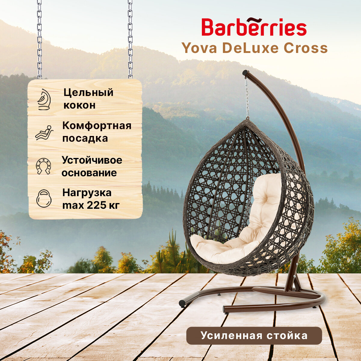 СохранитьПодвесное кресло кокон садовое Barberries Yova DeLuxe Cross. Стойка венге до 225 кг, подушка трапеция бежевая интересное: