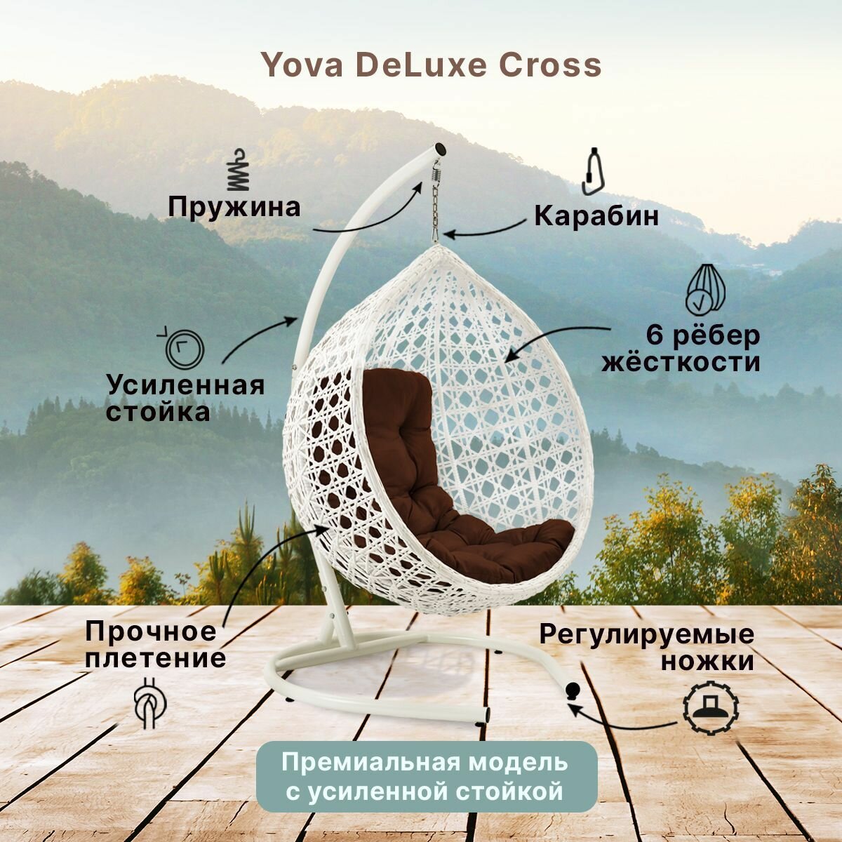 Купить Подвесное кресло кокон садовое Barberries Yova DeLuxe Cross. Стойка белая до 225 кг, подушка трапеция коричневая