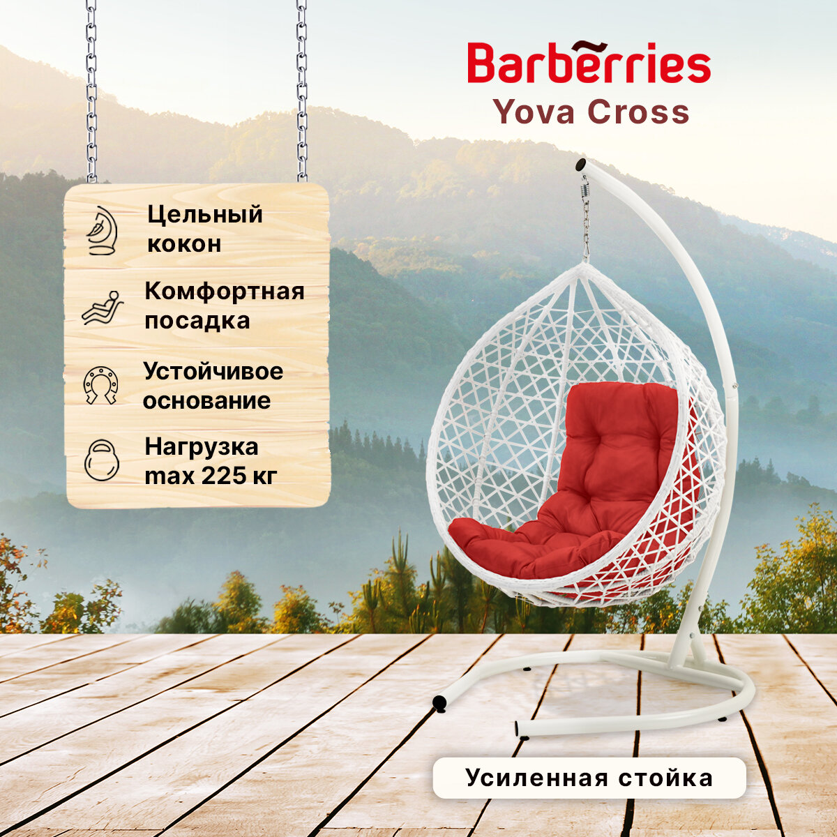Купить Подвесное кресло кокон садовое Barberries Yova Cross. Стойка белая до 225 кг, подушка трапеция красная