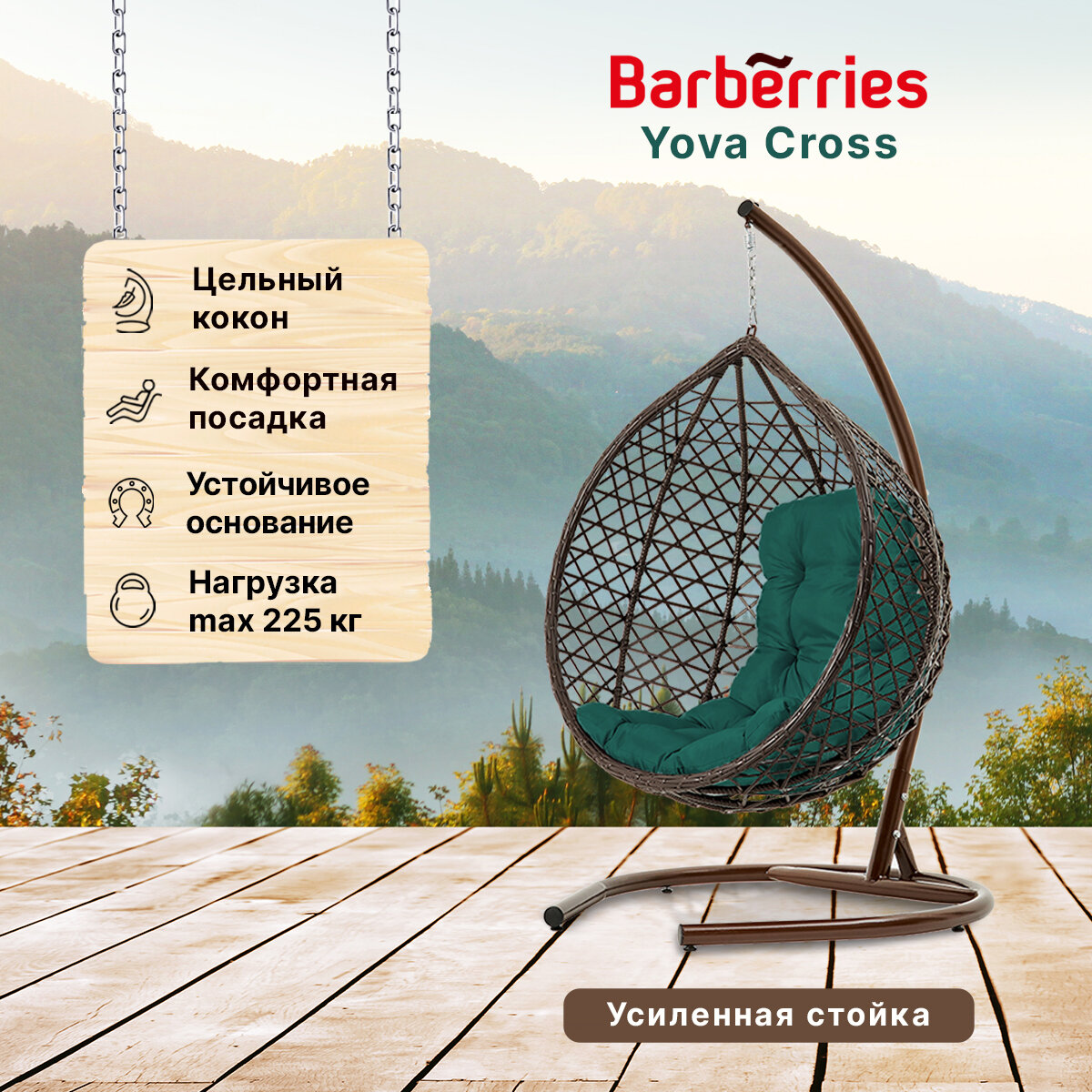 СохранитьПодвесное кресло кокон садовое Barberries Yova Cross. Стойка венге до 225 кг, подушка трапеция зеленая интересное:
