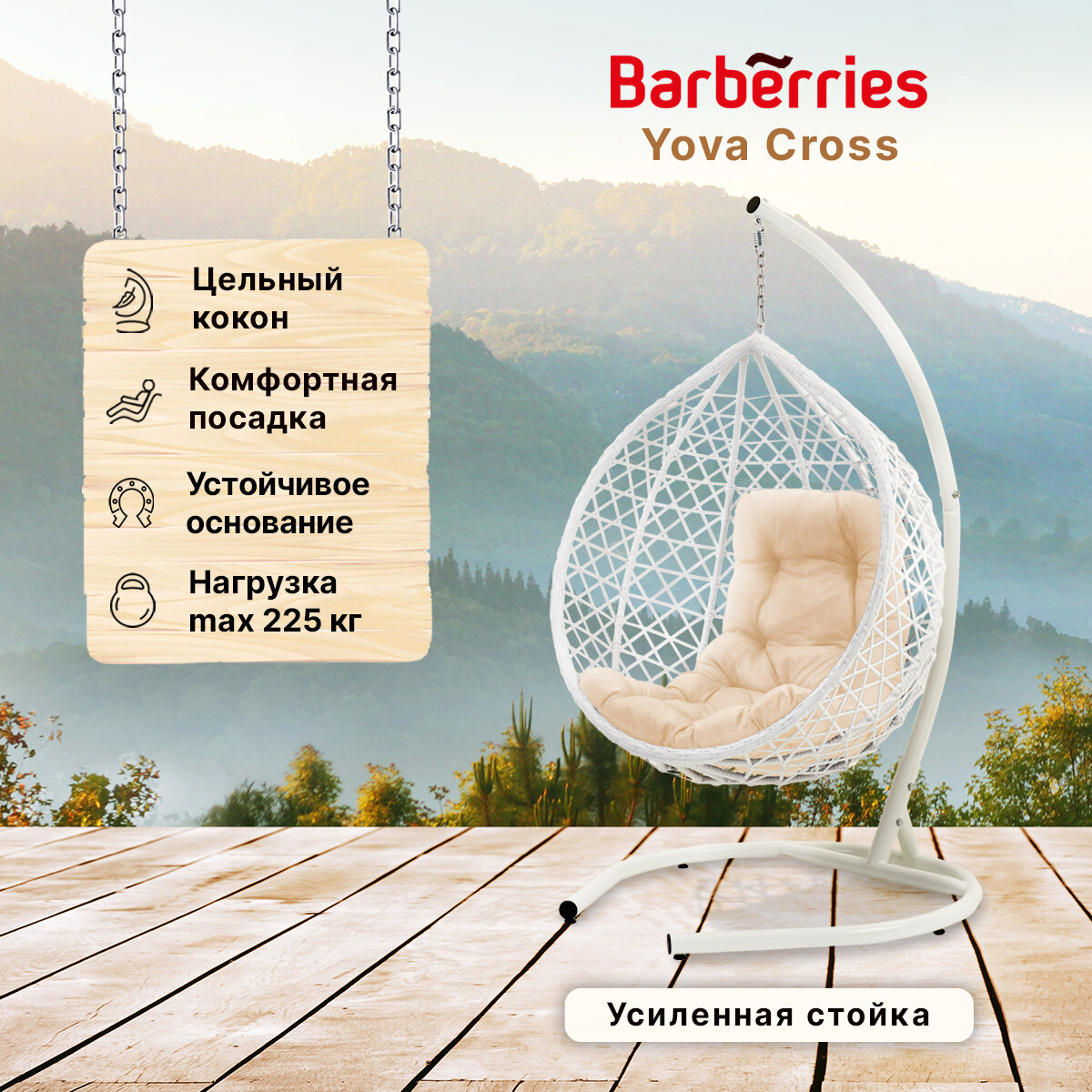 Купить Подвесное кресло кокон садовое Barberries Yova Cross. Стойка белая до 225 кг, подушка трапеция бежевая