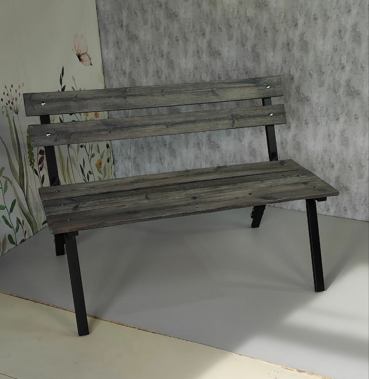 Скамейка садовая Классика с деревянными спинкой и сиденьем без покраски, лавочка для дачи с металлическим каркасом