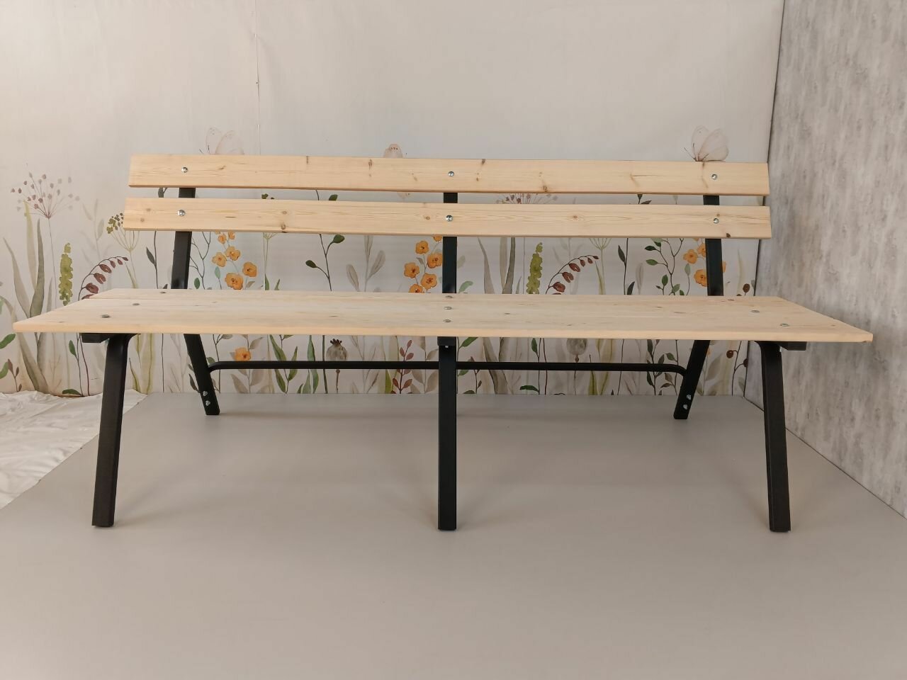 Скамейка садовая Классика с деревянными спинкой и сиденьем без покраски, лавочка для дачи с металлическим каркасом