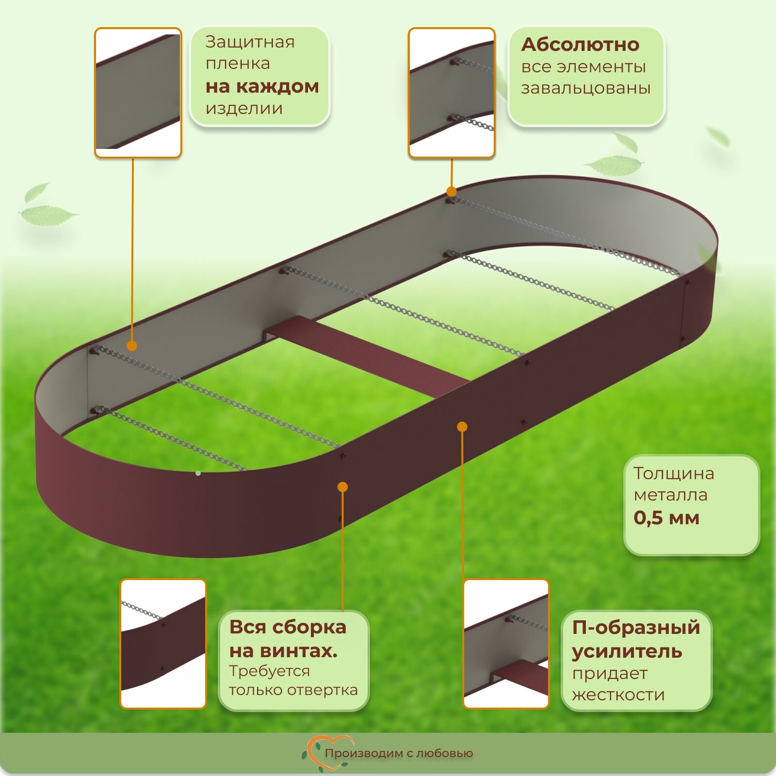Грядка оцинкованная с полимерным покрытием овальная, 1.5х0.6 м, высота 16 см, цвет Шоколад