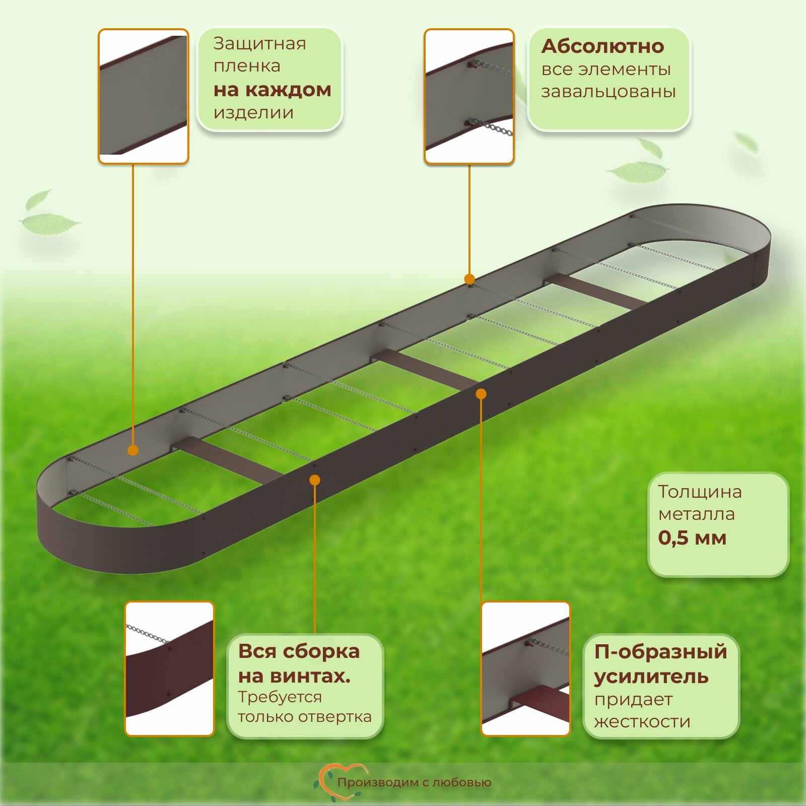 Грядка оцинкованная с полимерным покрытием овальная 1шт., 3.3х0.6 м, высота 16 см, цвет Шоколад