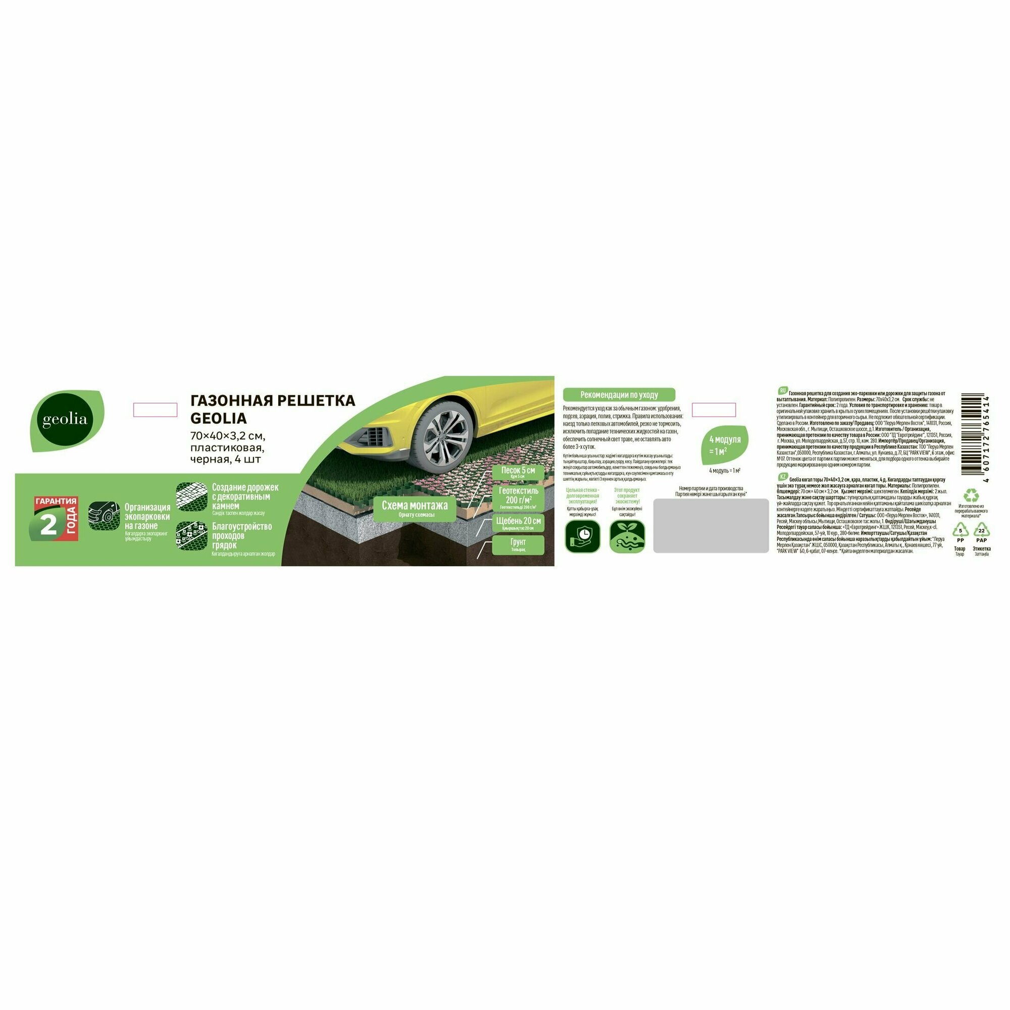 | Дополнительная информация | Решетка газонная Geolia 70х40х3.2 см полипропилен черный 4 шт |