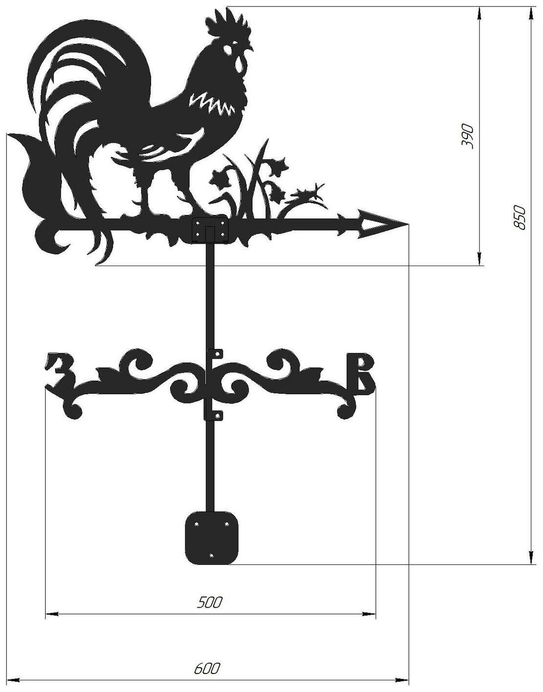 | Комплектация | Картинка флюгера 600х400 - 1 шт. Роза ветров С-Ю -1 шт. Роза ветров З-В-1 шт. Стойка -1 шт. Шарик -1 шт. Крепеж - 4 шт. Инструкция - 1 шт. |