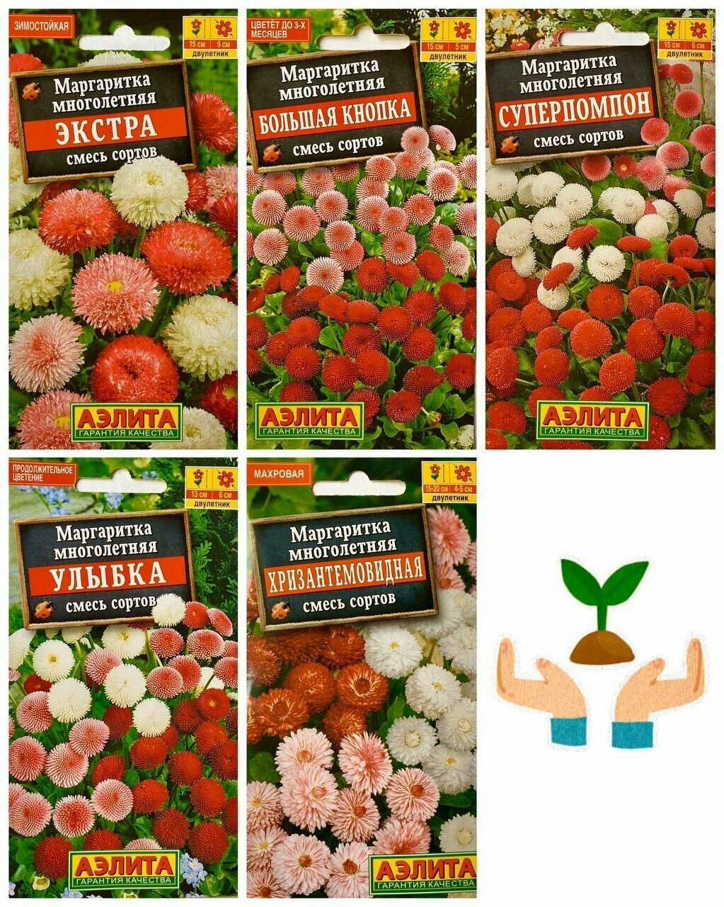 | Комплектация | В наборе 5 пакетика семян Маргаритки многолетний: Маргаритка Большая кнопка, смесь сортов 0.03г семян. Маргаритка Супер помпон, смесь сортов 0.05г семян. Маргаритка Улыбка махровая смесь сортов 0.05г семян. Маргаритка Хризантемовидная, смесь сортов 0.05г семян.Маргаритка Экстра, смесь сортов 0.05г семян. |