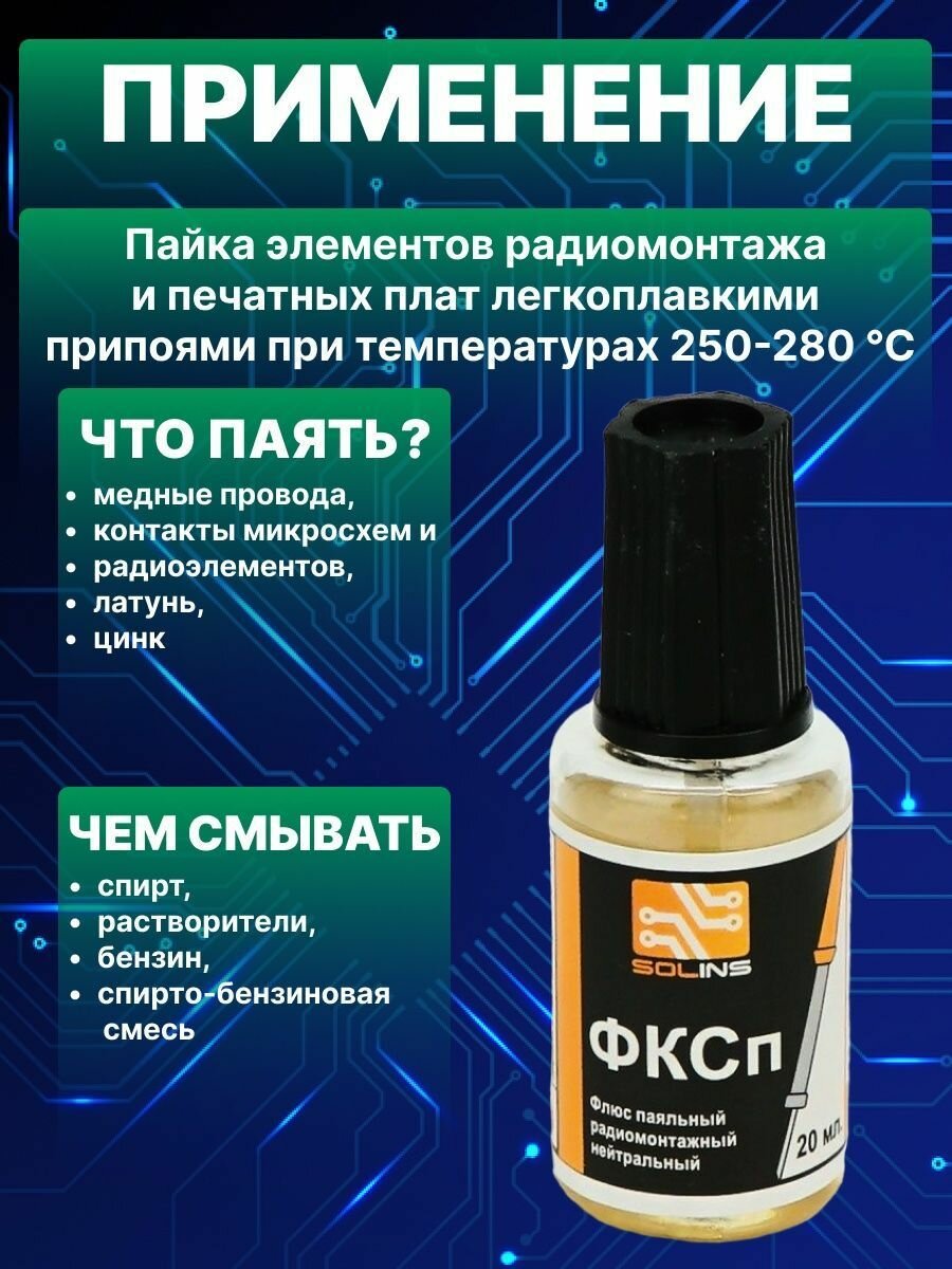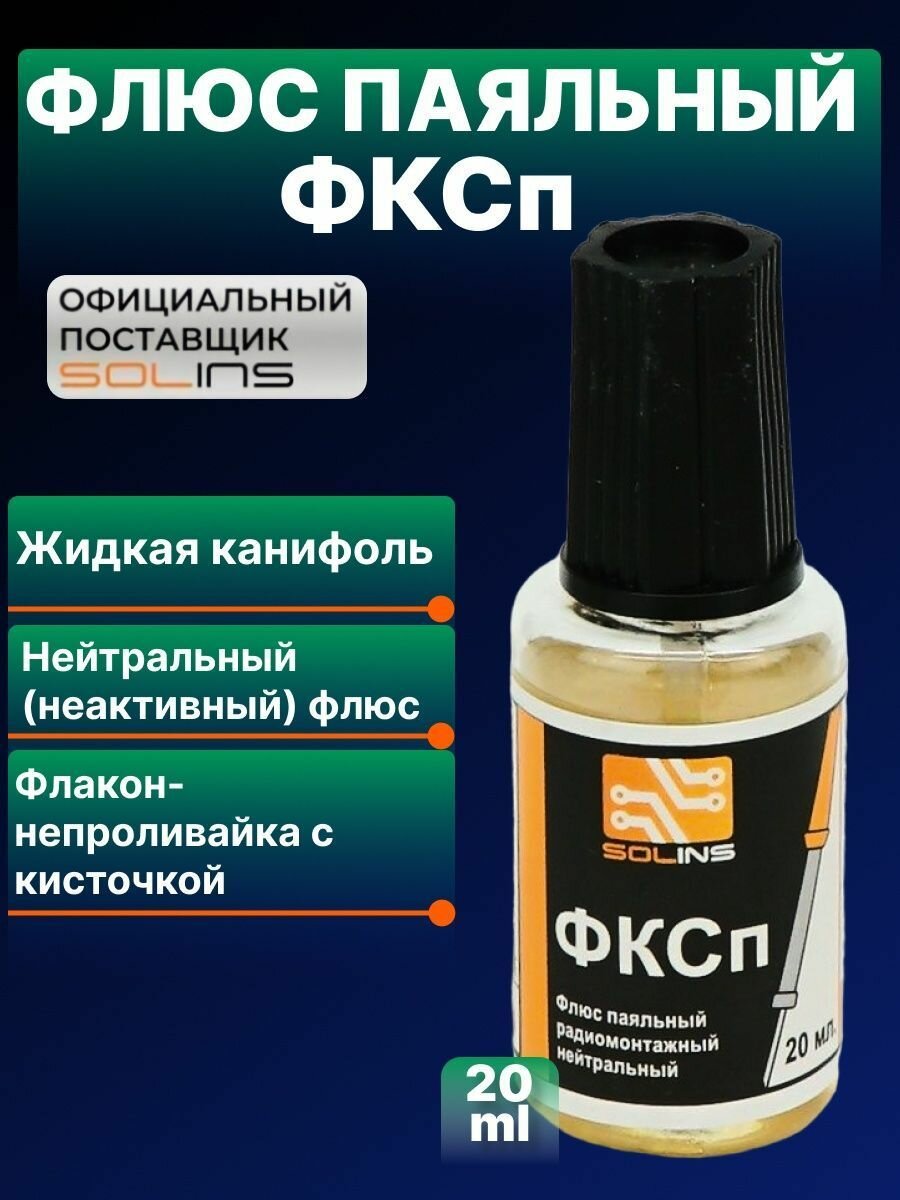 Флюс для пайки Solins ФКСп нейтральный, радиомонтажный, спирто-канифольный, с сосновой канифолью / Жидкий паяльный флюс для пайки печатных плат, меди, медных проводов, микросхем, с кисточкой 20 мл