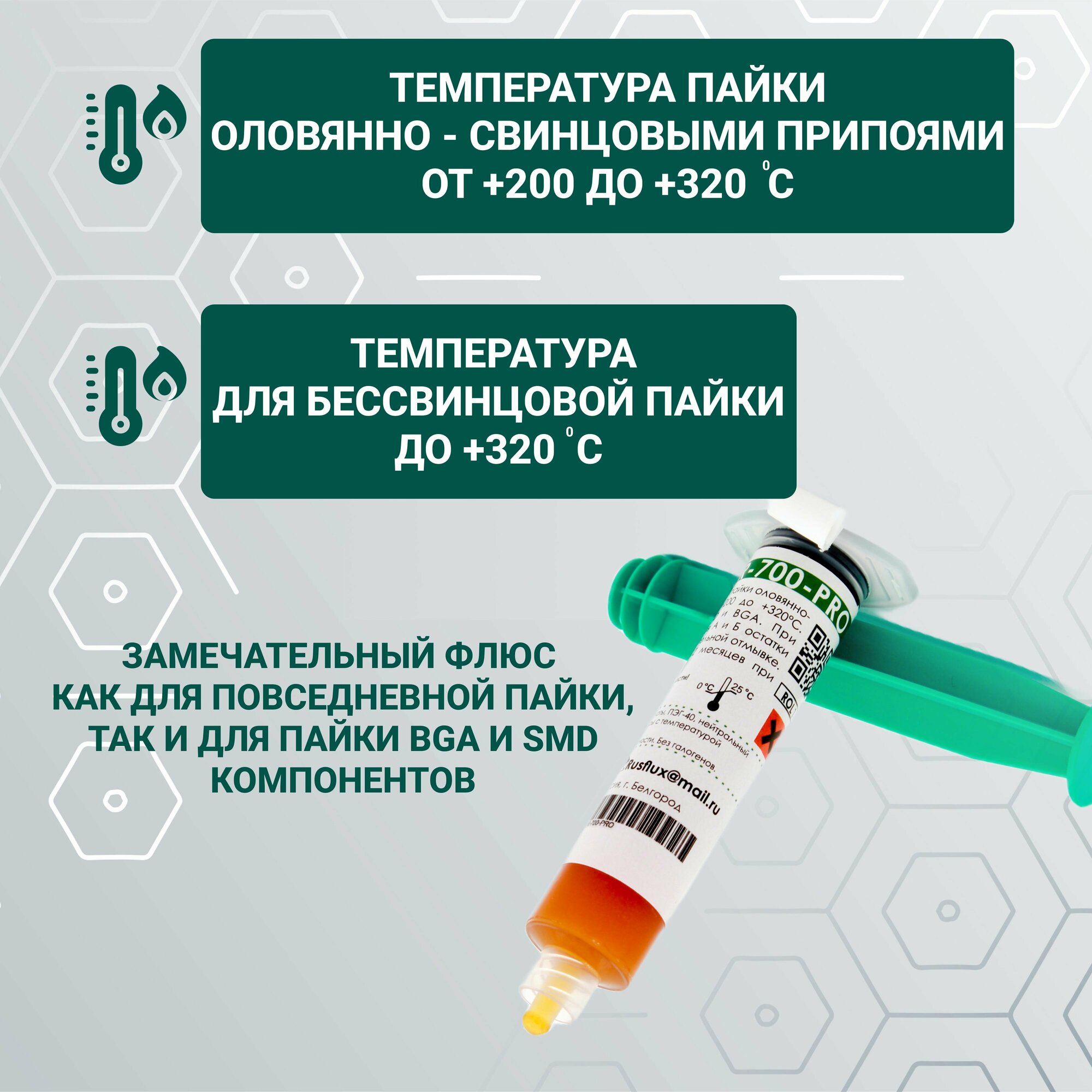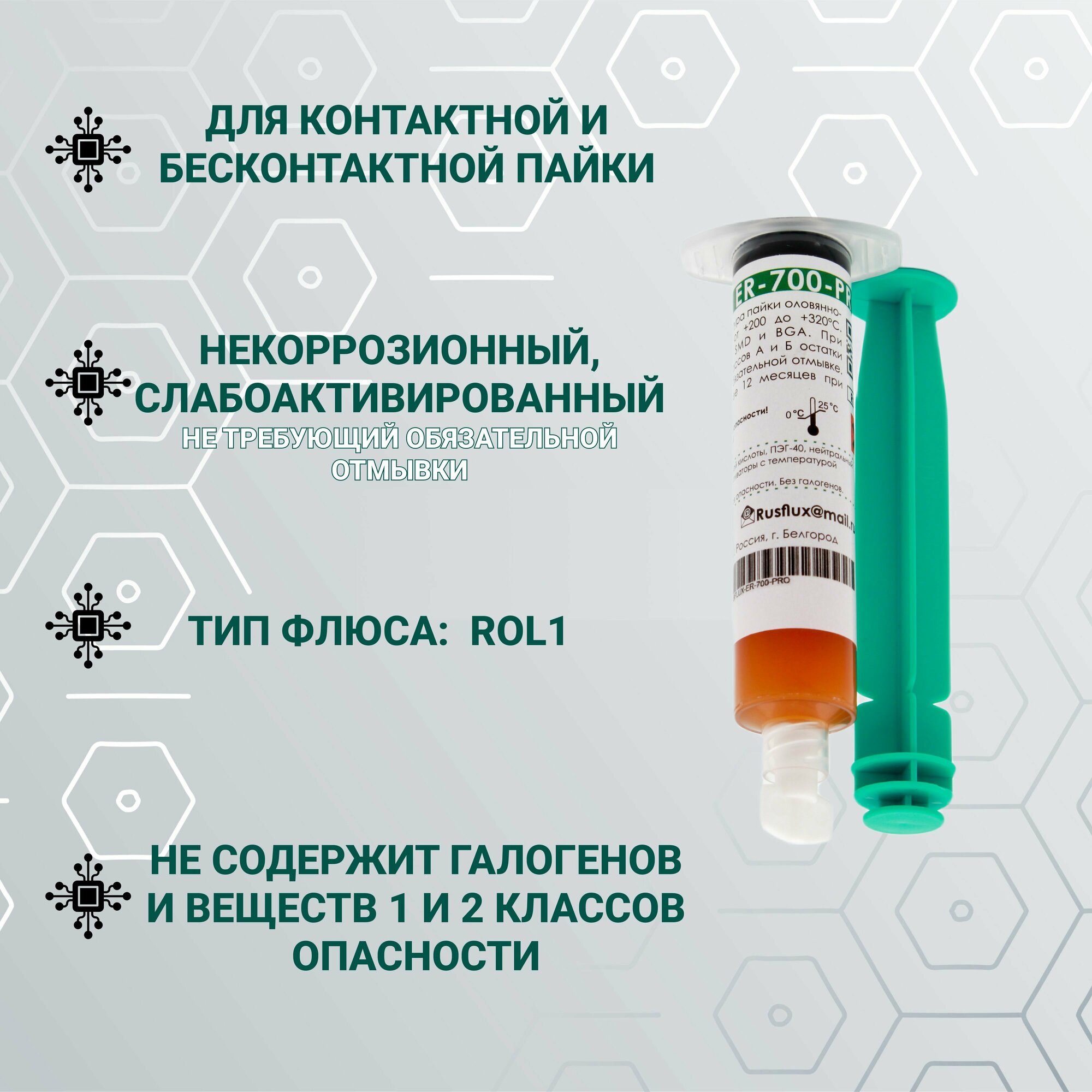 | Комплектация | Флюс ER-700-PRO шприц 10мл Rusflux-1 шт. |