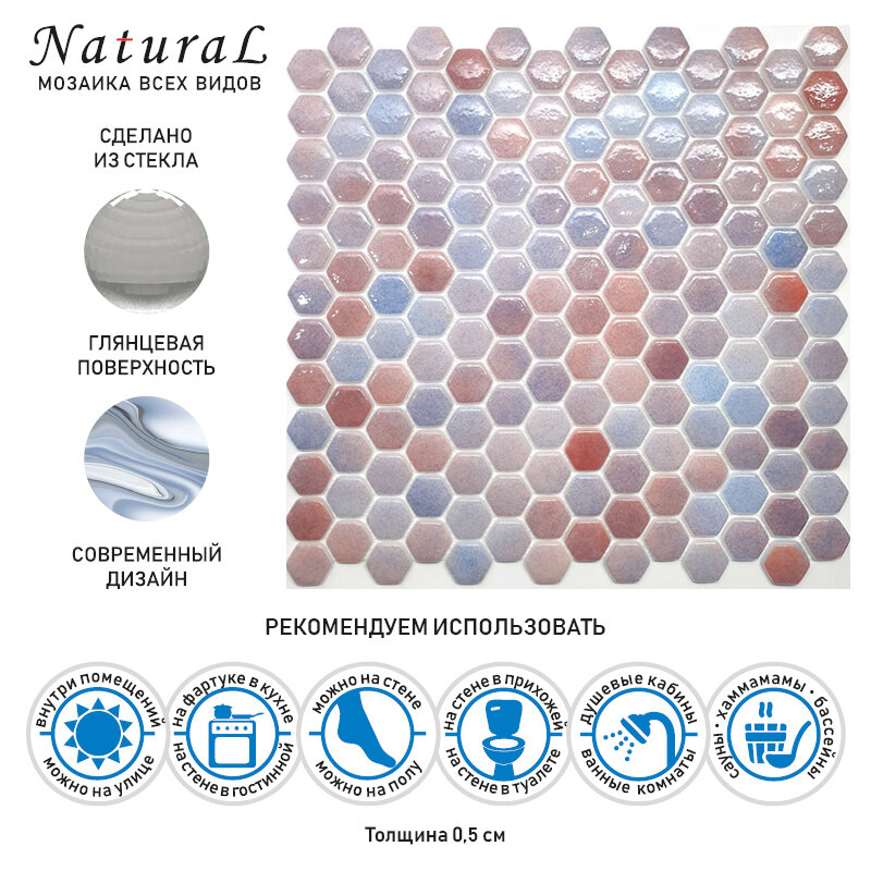 Мозаика Natural STP-RD002-HEX из глянцевого стекла размер 29х29 см чип 25 Hexagon мм толщ. 5 мм площадь 0.084 м2 на сетке интересное: