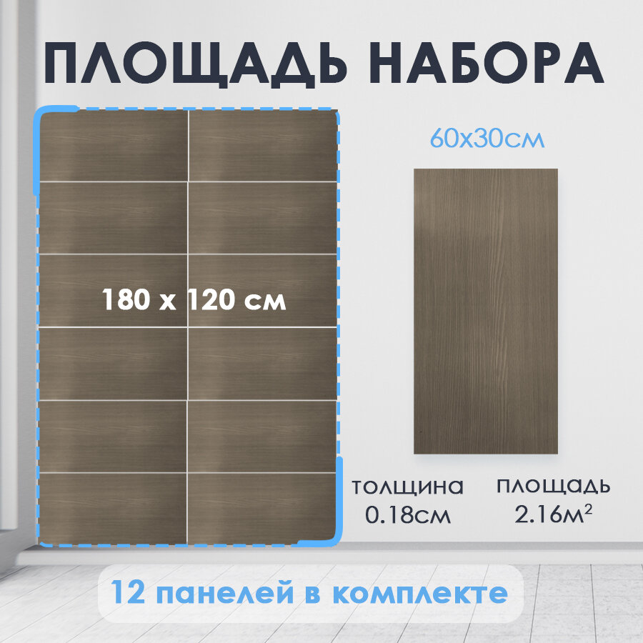 | Подробная комплектация | Упаковка Панели ПВХ самоклеящиеся 12 шт. размер 30х60, толщиной 0.18 см |