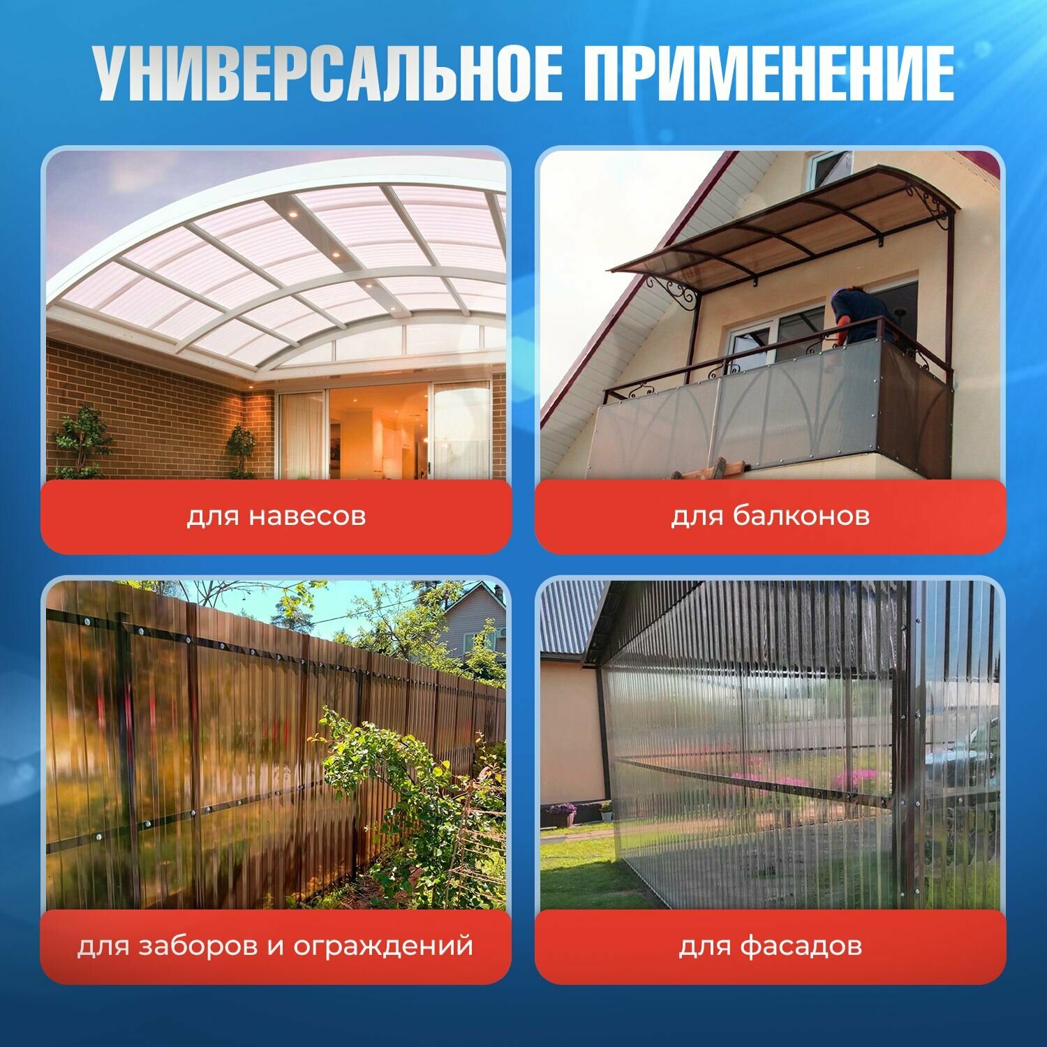 | Применение | Для балконов, Для заборов и ограждений, Для кровли, Для навесов |