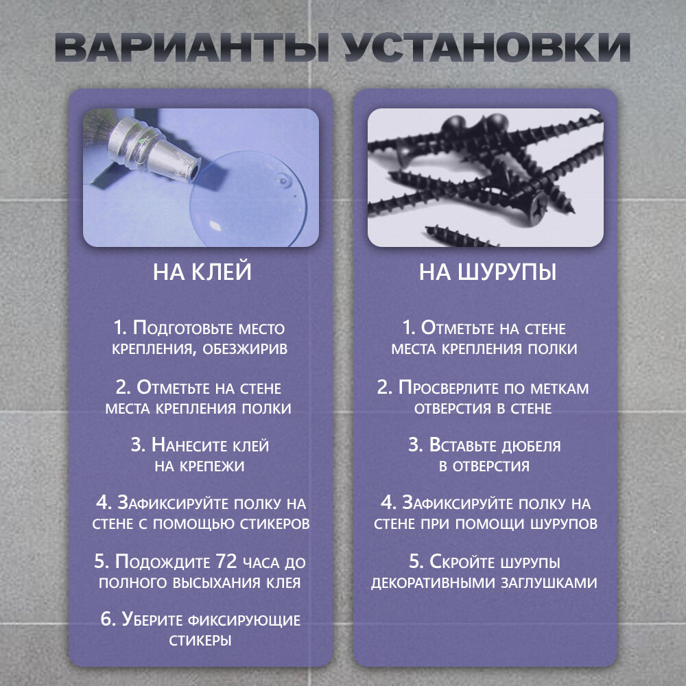 | Комплектация | Полка для ванной: 1 шт. Дюбеля- 1 уп. |