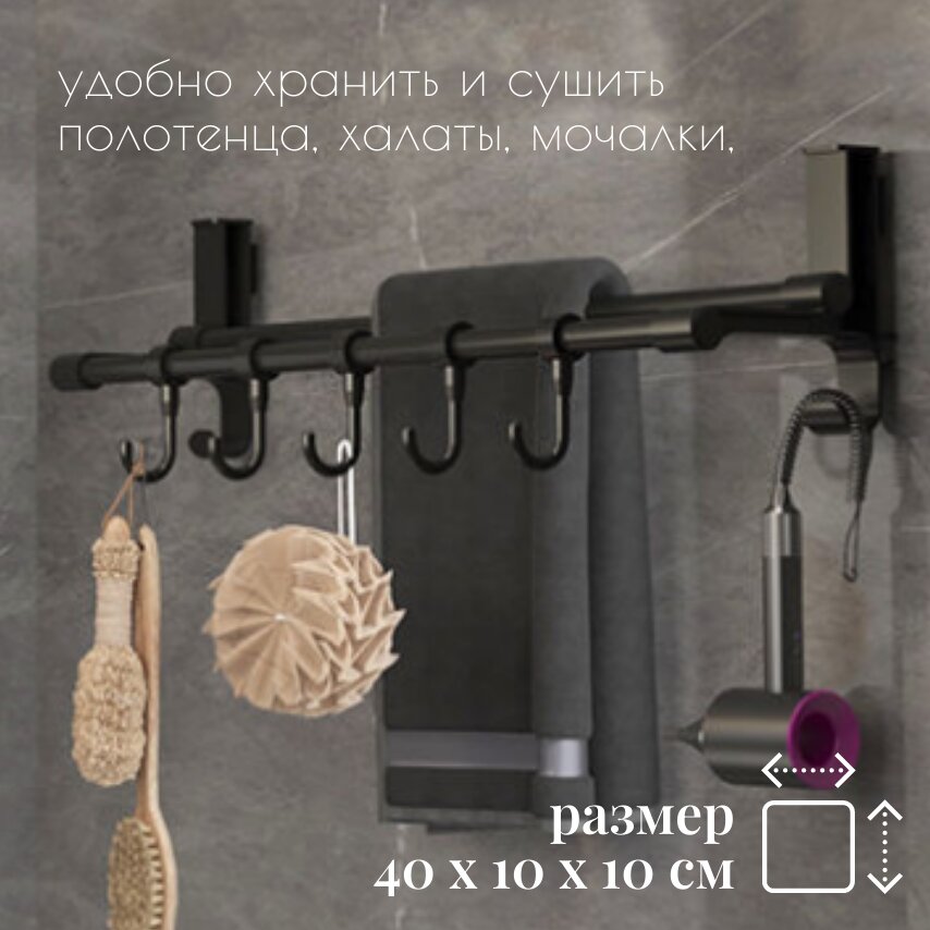 Полка настенная, держатель для полотенец с крючками для ванной и кухни, вешалка настенная матовая, черная. 40 см. интересное: