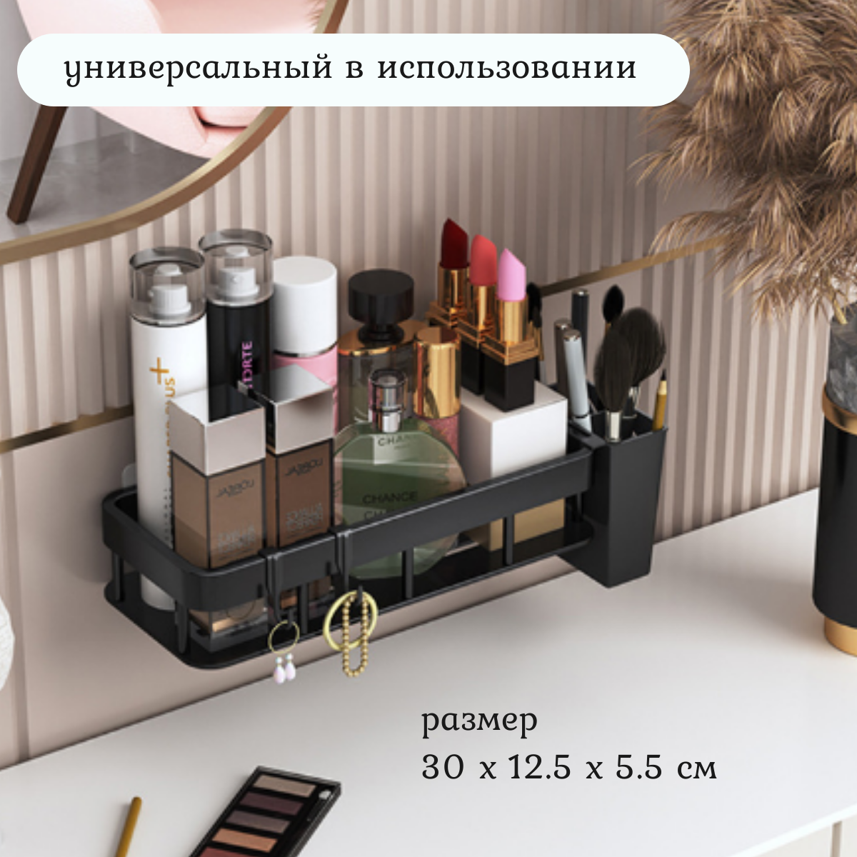 Полка настенная для ванной и кухни с крючками, полка для ванной с навесной чашкой, вешалка настенная матовая, черная. интересное: