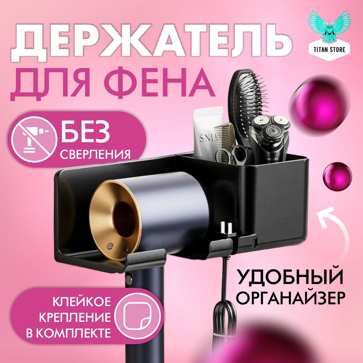 Держатель для фена настенный с органайзером для расчески, косметики самоклеющийся черный интересное: