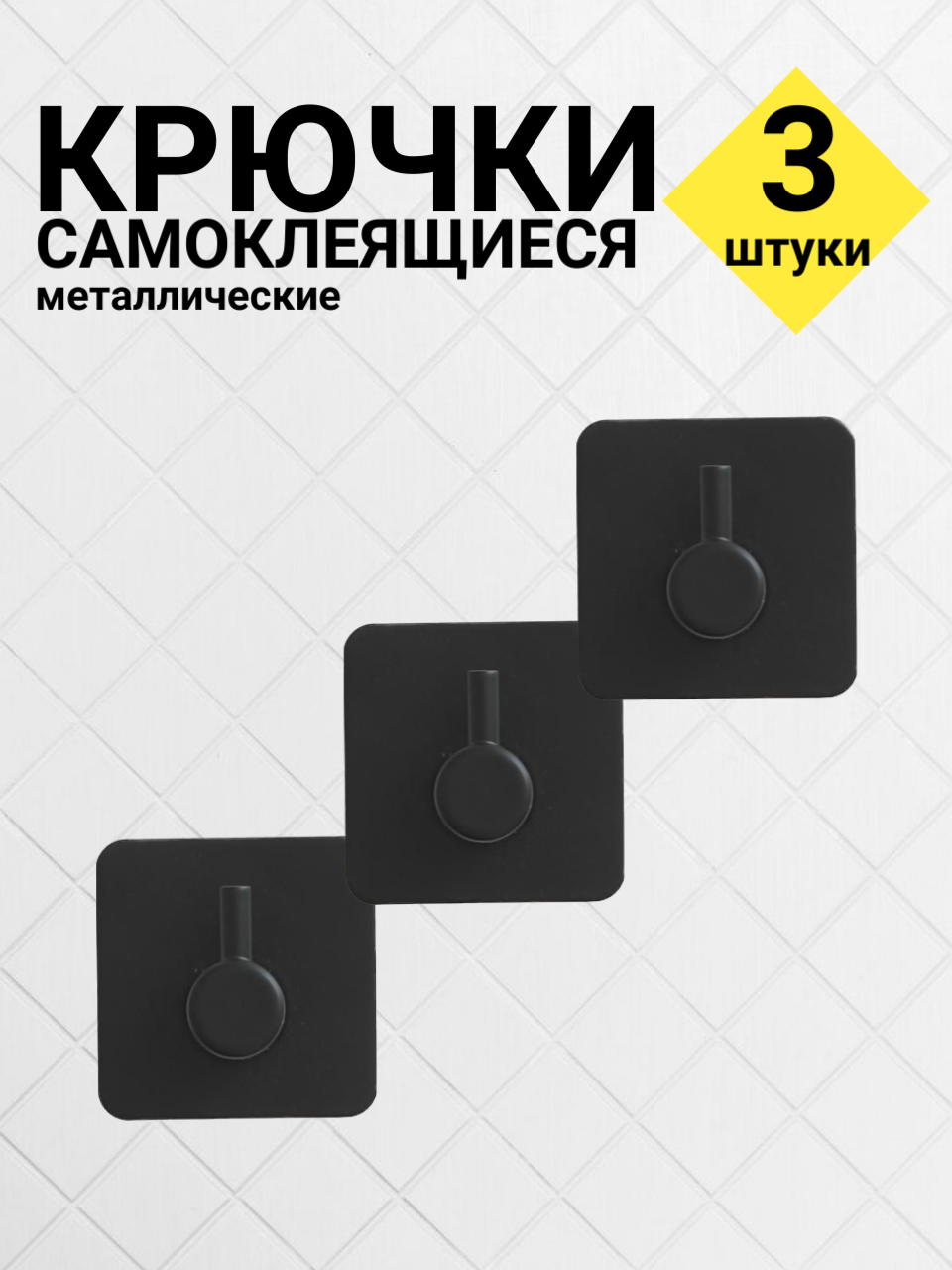Купить Крючки самоклеящиеся, 3 штуки, квадратные, черные