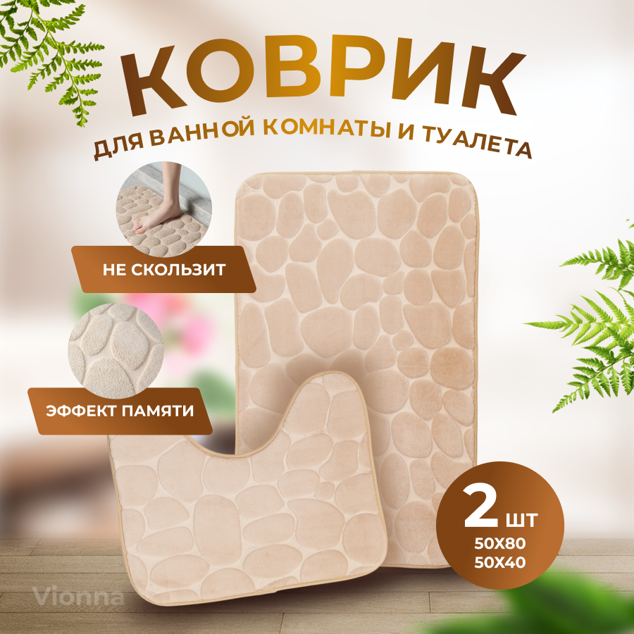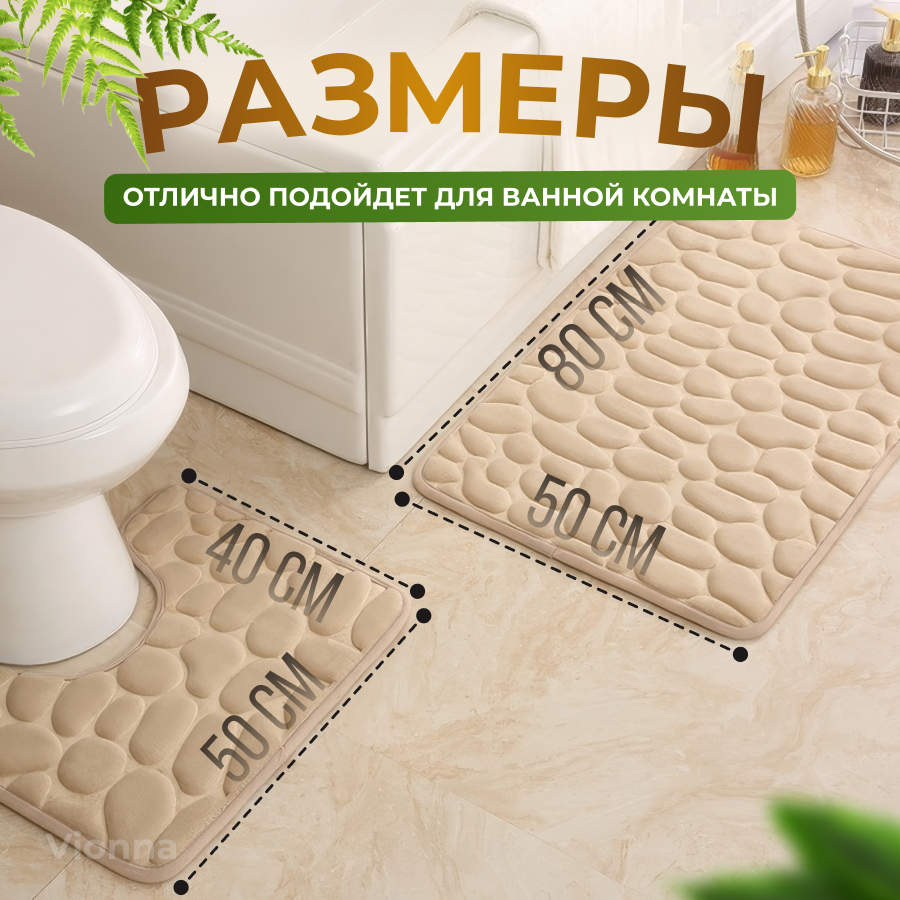 Коврик для ванной комнаты и туалета/ Набор противоскользящий ковриков "Камни" 2 шт (50х80 см), (50х40см)-бежевый интересное: