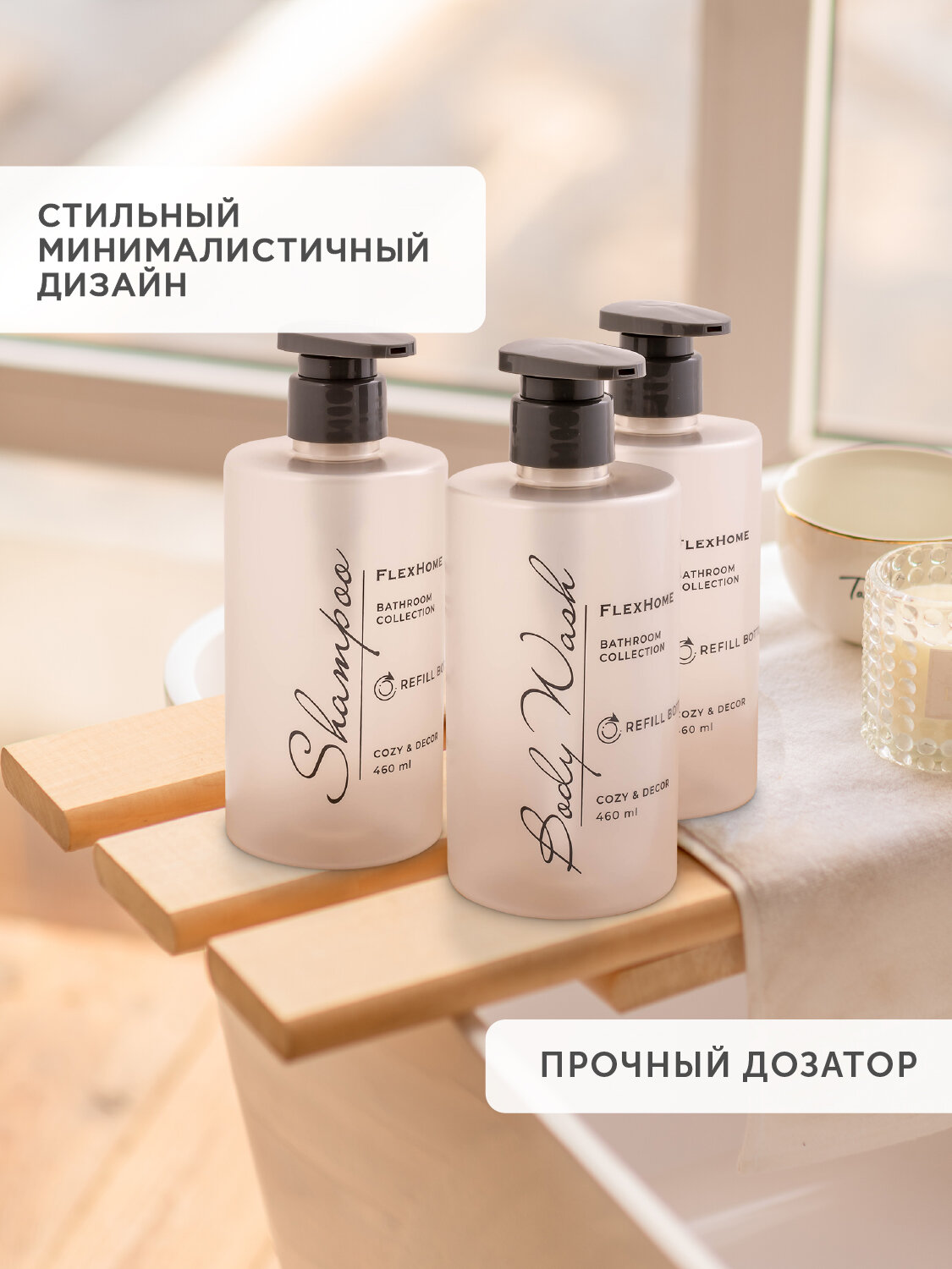 Купить Набор дозаторов для ванной 3 штуки по 460 мл из прозрачного белого пластика, FlexHome, с шелкографией