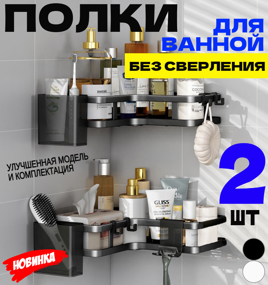 Полка для ванной и кухни угловая без сверления на липучках черная 2 шт интересное: