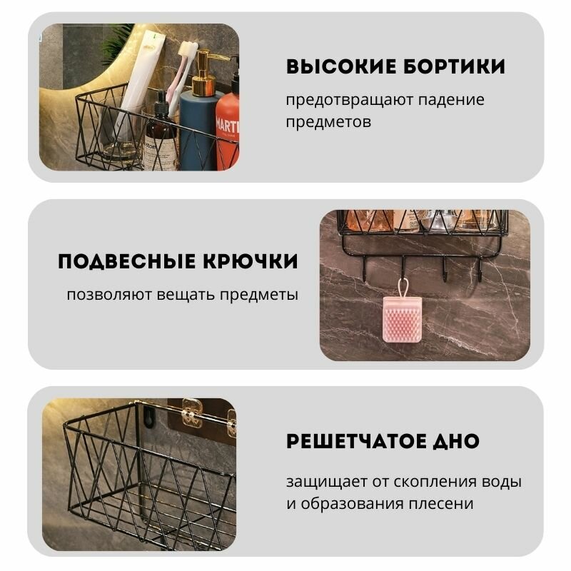 Полка металлическая для ванной с крючками, без сверления, черная интересное: