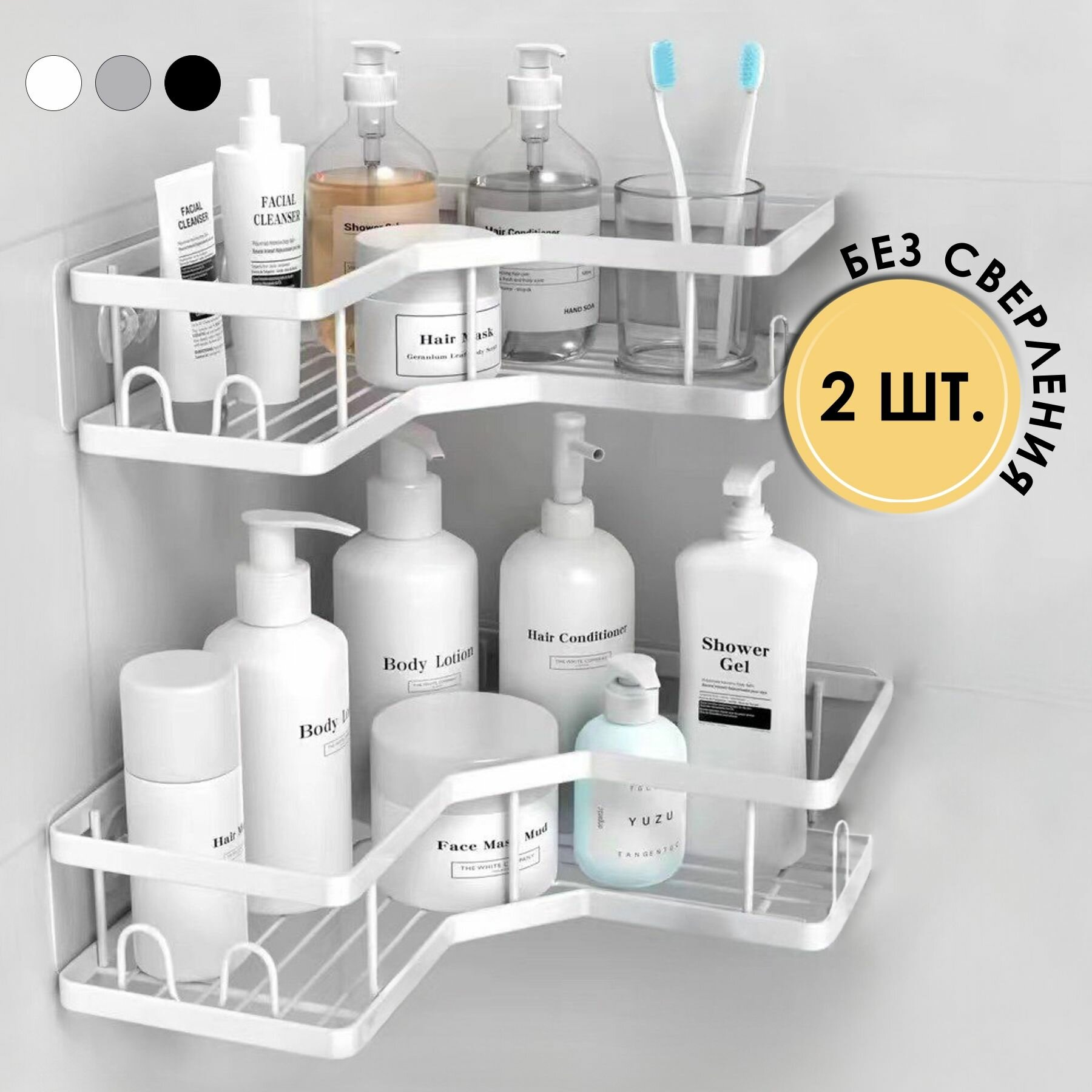Купить Полка для ванной комнаты угловая самоклеющаяся без сверления / Подвесной органайзер с крючками для душевой кабины, туалета, кухни / Подставка настенная металлическая на липучках, белая, 2 шт