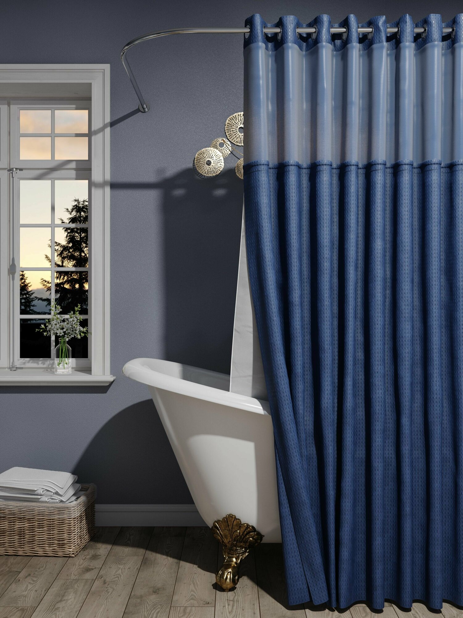 СохранитьШтора для ванной и душа, 180х200 см, двойная, тканевая, водоотталкивающая, синяя. Занавеска в ванную комнату с люверсами, с прозрачной вставкой интересное: