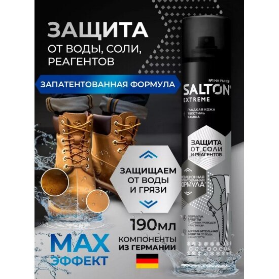 Ниже Вы можете прочитать отзывы на Водоотталкивающая пропитка для защиты обуви от реагентов и соли Salton Extreme, 190 мл, ознакомится с подробными характеристиками, посмотреть интересные обзоры и фотографии на Водоотталкивающая пропитка для защиты обуви от реагентов и соли Salton Extreme, 190 мл.