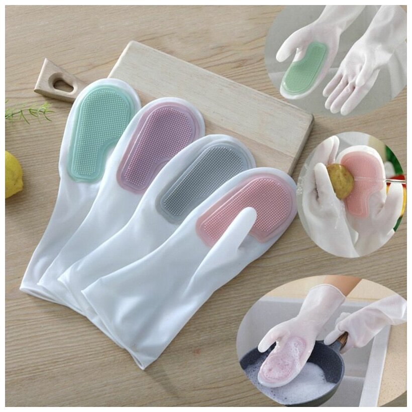 Многоразовые резиновые перчатки с щеткой для уборки и чистки, розовый