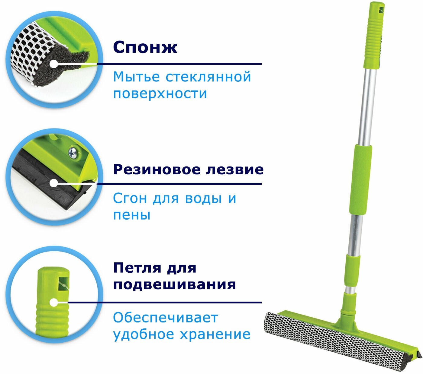 Щетка для мытья окон Hitt, резиновый скребок и губка, телескопическая ручка 96 см
