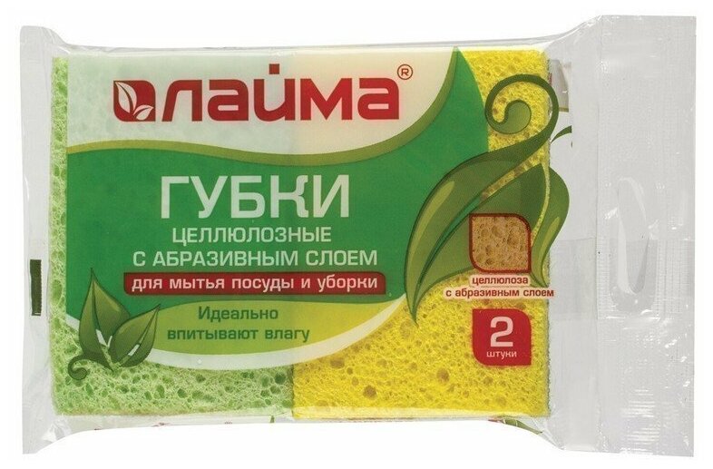 Губки для посуды Лайма 2 шт, целлюлозные c абразивом, 2х9,5х6,5 см (605487)