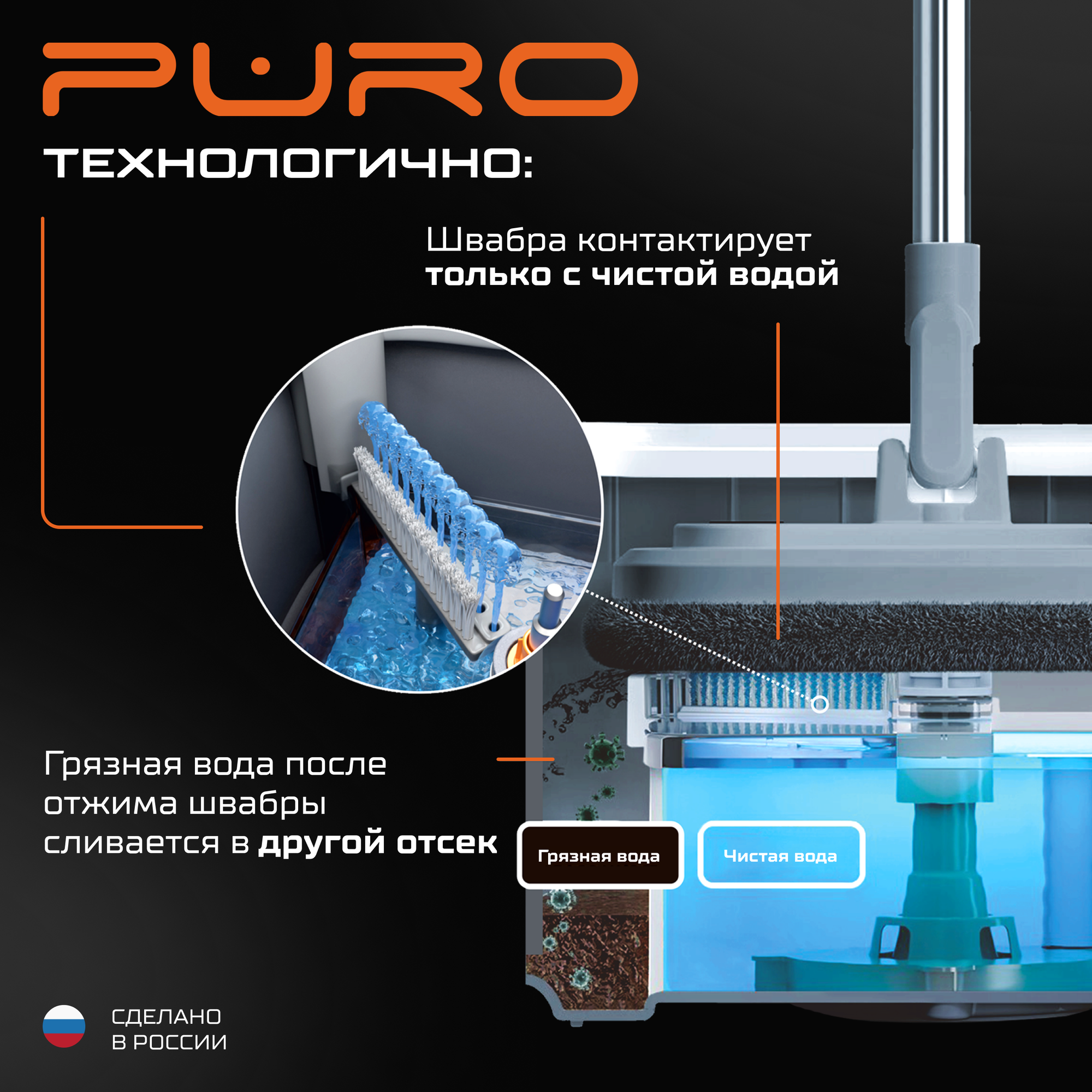 Швабра с отжимом и ведром, комплект для уборки PURO PRO, черный
