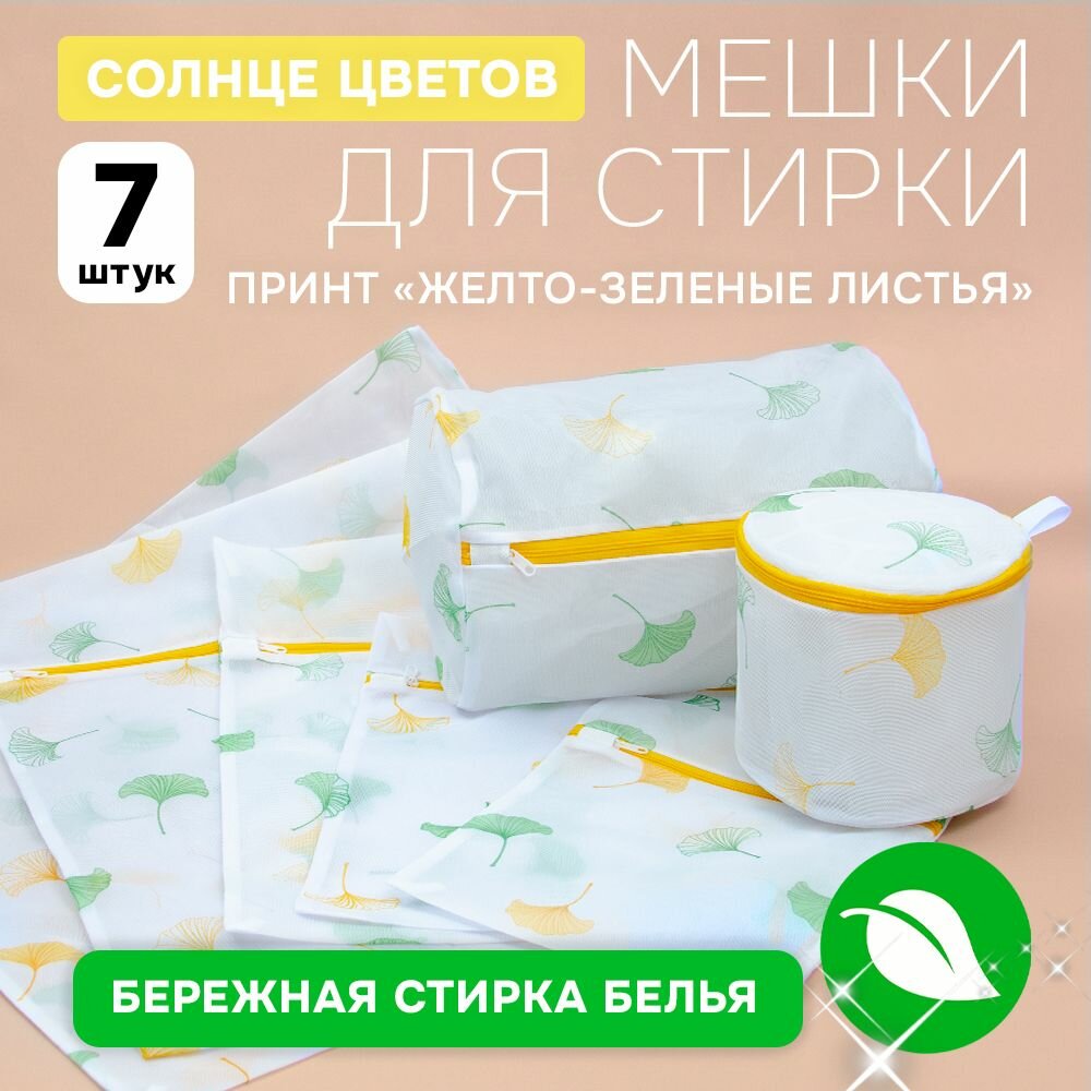 Купить Набор мешков для стирки с молнией, тонкая сетка "солнце цветов" (желто-зеленые листья, 7 размеров в наборе)