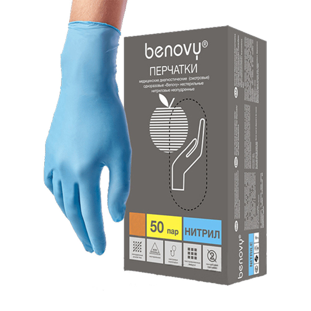 Перчатки нитровинил Benovy L (голубые), 100 шт (50 пар)