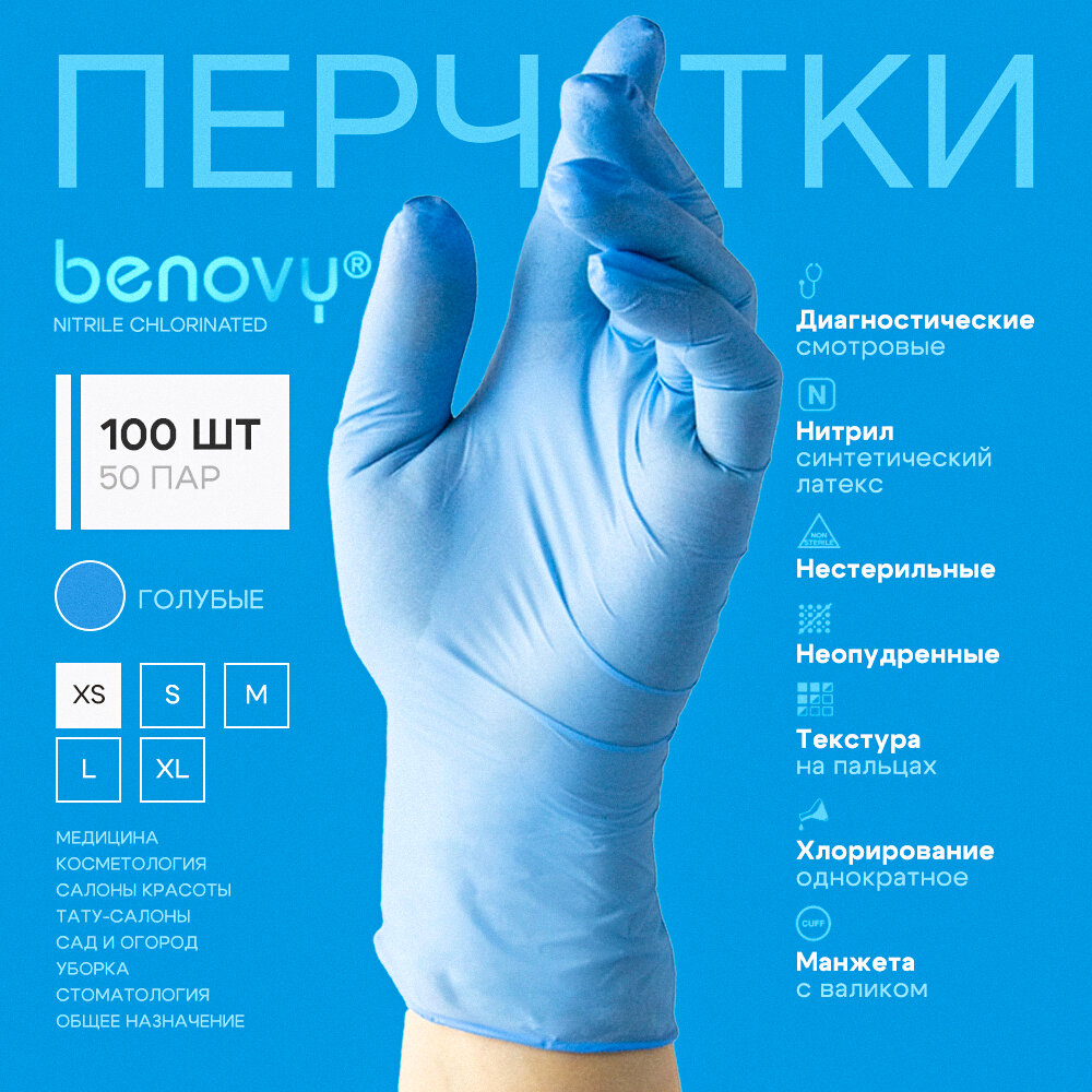 СохранитьПерчатки BENOVY Nitrile Chlorinated, Размер XS, Голубые, 100шт (50 пар), нитриловые, одноразовые. интересное: